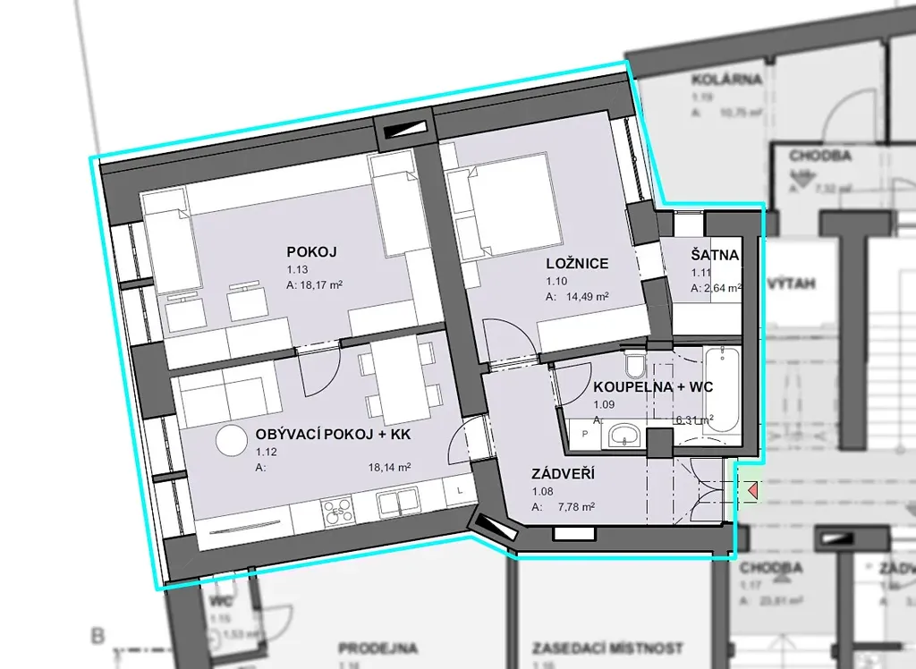 Dispozice bytové jednotky: předsíň [6,2m2], obytná místnost s kuchyňským koutem [18m2], koupelna + WC [5,5m2], ložnice [14m2] se šatnou [3m2], pokoj [18,5m2]. K dispozici je sklepní kóje ve vnitrobloku o výměře [2m2].