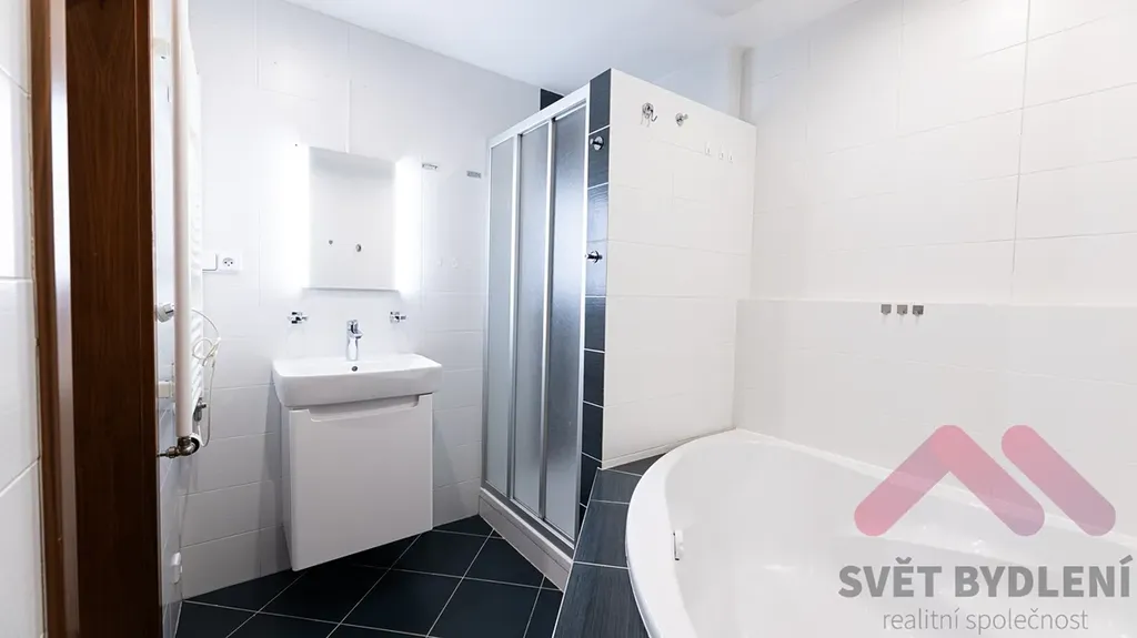 Byt se nachází v 2.NP novostavby s orientací do volného prostoru a na zeleň. K dispozici jsou po vstupu do bytu dvě samostatné ložnice, samostatná šatna a toaleta. Z chodby je taktéž přístupná prostorná koupelna kde naleznete jak rohovou vanu tak i sprchový kout spolu s pračkou. Prostorný obývák je spojen s kuchyňským koutem, zařízeným novými spotřebiči, jako : horkovzdušná trouba, mikrovlnka, sklokeramická deska, americká - dvoukřídlá lednice s výrobnou ledu a myčka. Neopomenutelnou výhodou tohoto bytu je i samostatná garáž v suterénu domu se zamykatelnými vraty. Cena bytu včetně garáže je 29.500,-Kč + služby 5.000Kč + elektřina se převádí na nájemníka. Volné ihned!