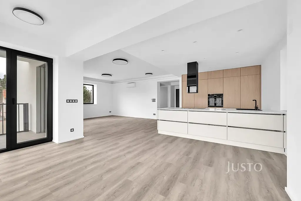 Dispozice bytu nabízí: velkorysý obývací pokoj s kuchyňským koutem o ploše 52,9 m², dva samostatné pokoje (20,8 m² a 18,0 m²), ložnici (13,9 m²), prostornou vstupní halu (22,6 m²), komoru, samostatné WC a dvě koupelny – jedna s vanou i sprchovým koutem (8,0 m²), druhá se sprchou (4,9 m²). Moderní kuchyň je vybavena linkou na míru včetně spotřebičů – lednice, mrazák, myčka a elektrická varná deska. Byt se pronajímá nevybavený.