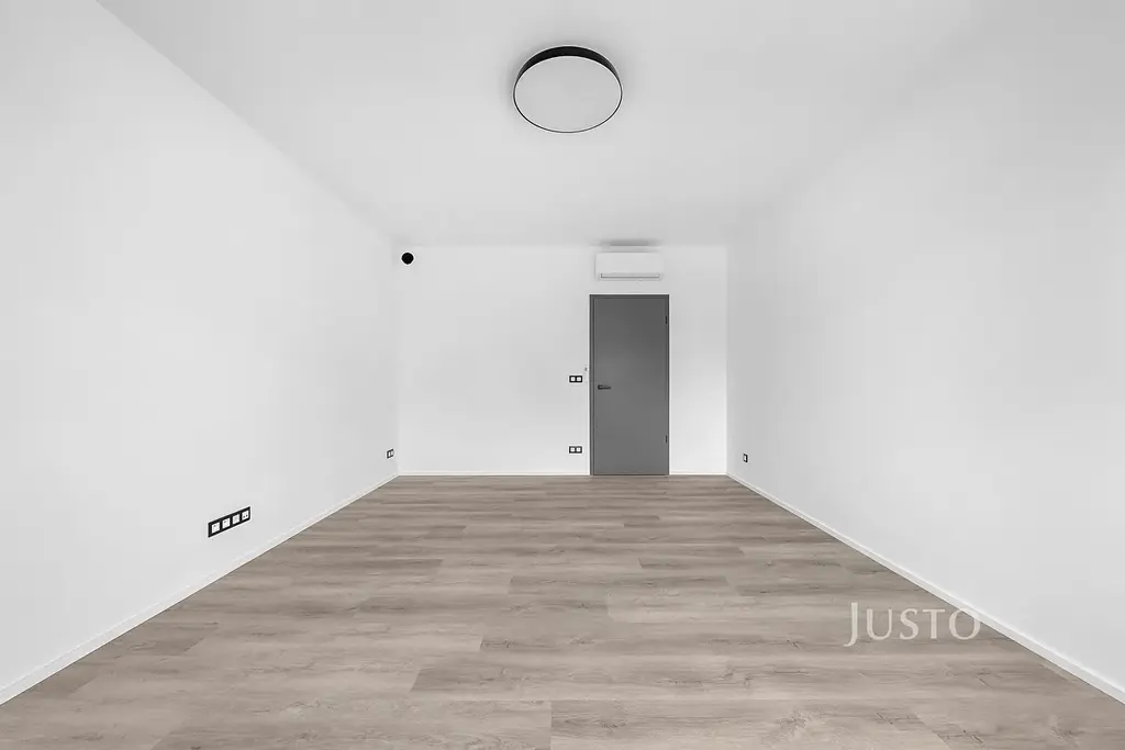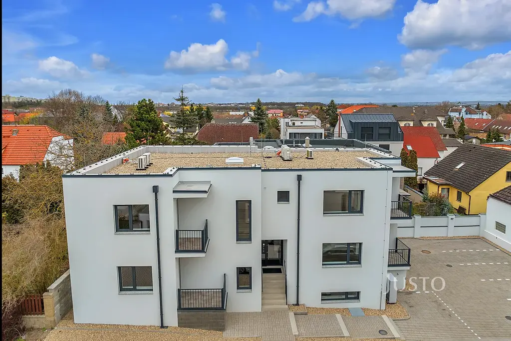 Interiér bytu je světlý díky velkým hliníkovým oknům s venkovními roletami. Podlahové vytápění s tepelným čerpadlem zajišťuje příjemné klima po celý rok, komfort umocňuje i klimatizace. V koupelnách dominuje kvalitní velkoformátová dlažba a moderní sanita. Díky preciznímu zpracování a promyšlenému designu poskytuje byt vysoký standard bydlení.