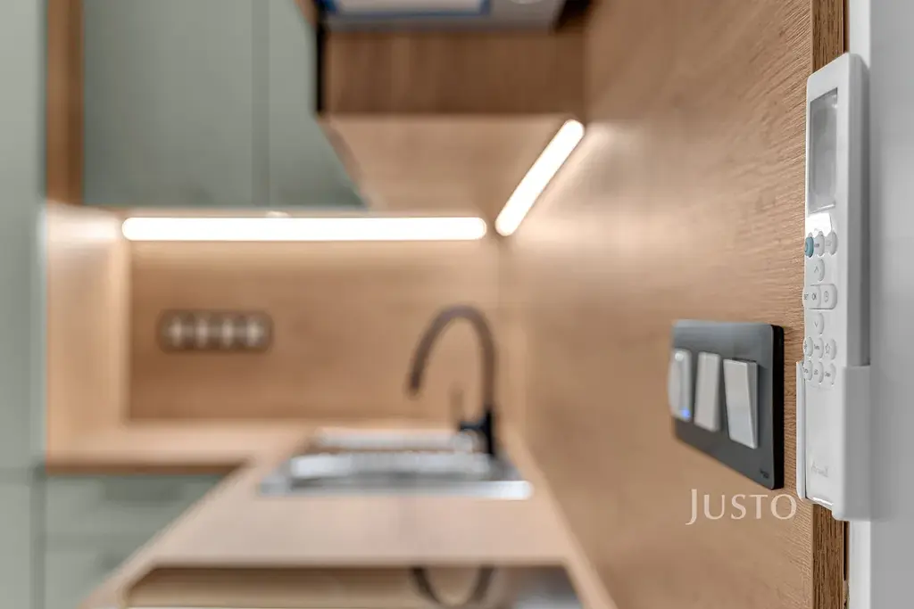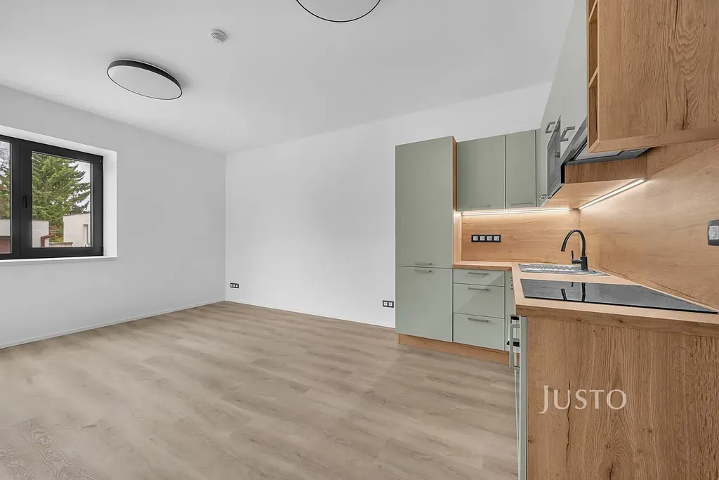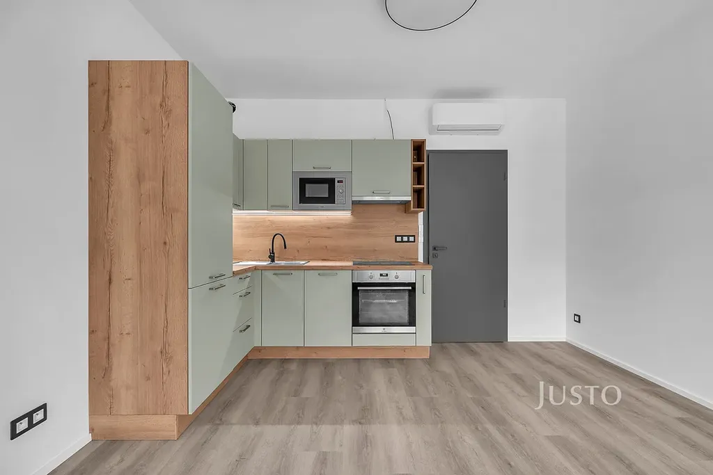 Dispozice bytu nabízí prostorný obývací pokoj s kuchyňským koutem (20,8 m²), ložnici (13,8 m²), koupelnu s vanou (4,9 m²) a chodbu (6,1 m²). Kuchyňská linka na míru je vybavena lednicí, mrazákem, myčkou a elektrickou varnou deskou. V celém bytě je podlahové vytápění napojené na tepelné čerpadlo, hliníková okna jsou opatřena venkovními roletami a v bytě je klimatizace pro zajištění komfortu v každém ročním období.