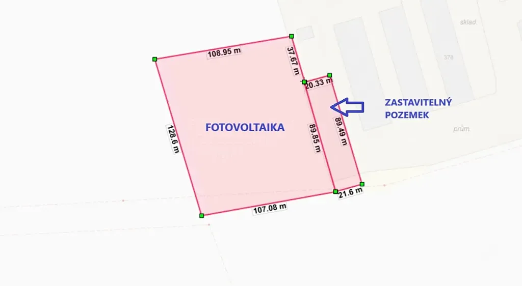 Na druhé části pozemku o výměře 13.700 m2 je momentálně možné realizovat FVE, do budoucna po zasíťování lokality se počítá se zařazením do plochy na komerční výstavbu.