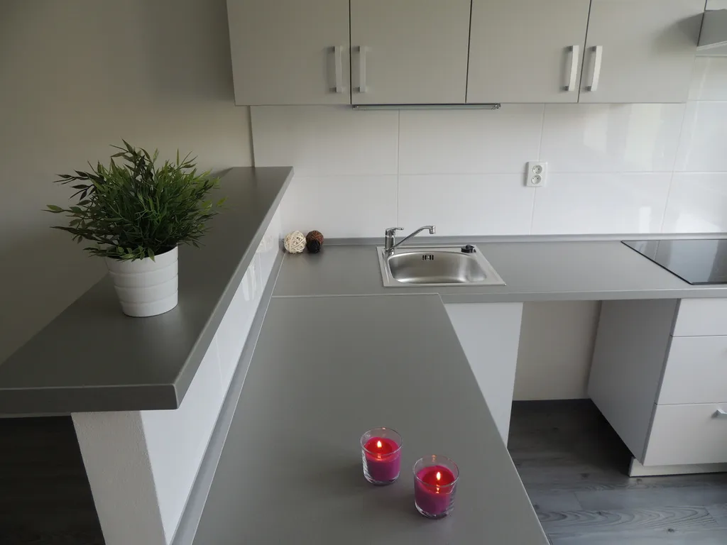 Kuchyňská linka je dělaní na míru a je opatřena elektrickou sklokeramickou deskou a digestoří.