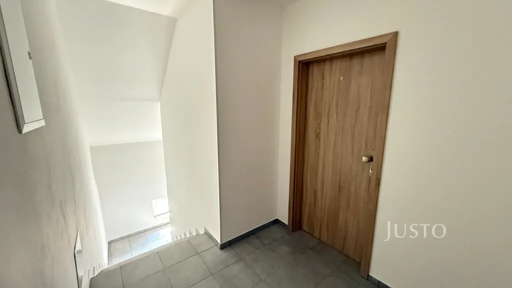 Interiér bytu je ve nový, nabízí vzdušný a světlý prostor s krásnými střešními okny, která propouštějí dostatek denního světla a podtrhují příjemnou atmosféru podkroví. Součástí je moderní kuchyňská linka na míru včetně vestavěné trouby a varné desky. Podlahy jsou pokryty kvalitní laminátovou krytinou v dekoru dřeva, což celkově působí velmi útulně a nadčasově. Vytápění bytu je řešeno lokálně elektrickým kotlem s radiátory, ohřev vody zajišťuje elektrický bojler.