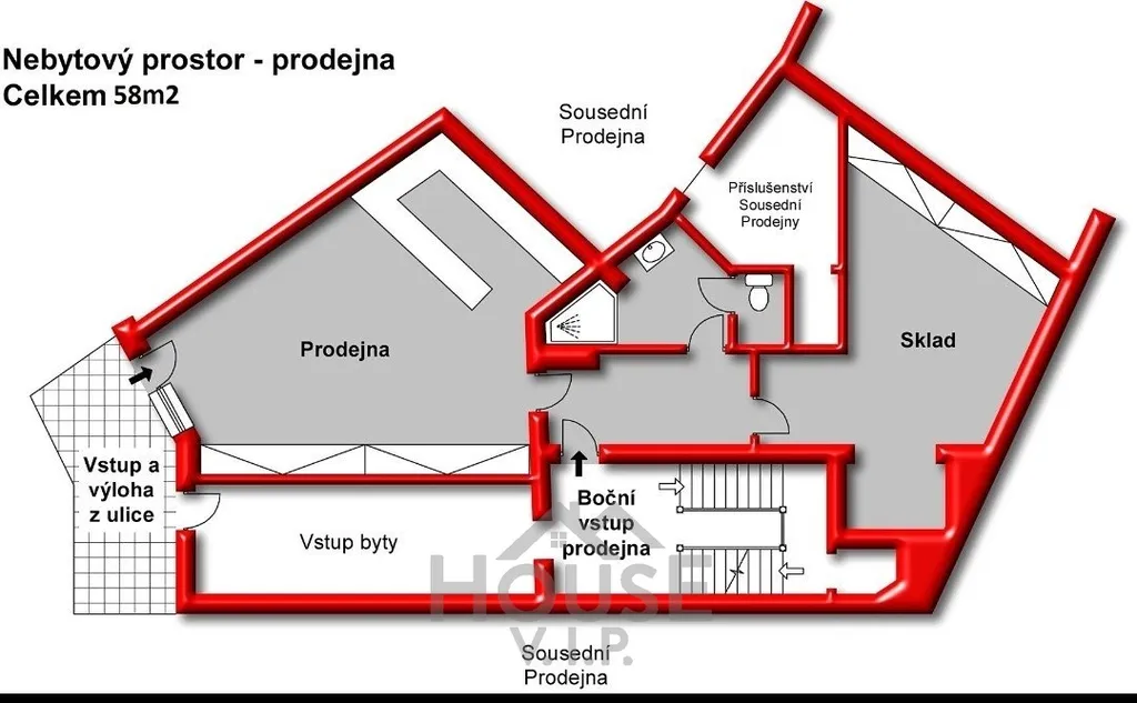 Nebytová jednotka o celkové výměře 58 m² se nachází v přízemí zděné budovy a disponuje vlastní výlohou, která zajišťuje vynikající viditelnost a přirozený pohyb potenciálních zákazníků. Prostor byl dosud využíván jako vinárna, nicméně díky své dispozici nabízí široké spektrum možného využití dle individuálních podnikatelských záměrů.