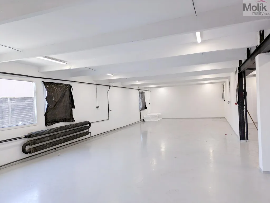 Prostory se nachází ve zvýšeném přízemí (1.NP) a jsou vhodné například na skladování materiálu či výrobu. Uskladnění těžších materiálů je možné zajistit vysokozdvižným vozíkem, který je k dispozici v areálu po domluvě s majitelem. Prostory jsou vytápěné kamny na pelety a tuhá paliva. Součástí pronájmu je místnost o velikosti 10 m2, která může sloužit jako kancelář, šatna, nebo kuchyňka a soukromá umývárna s WC.