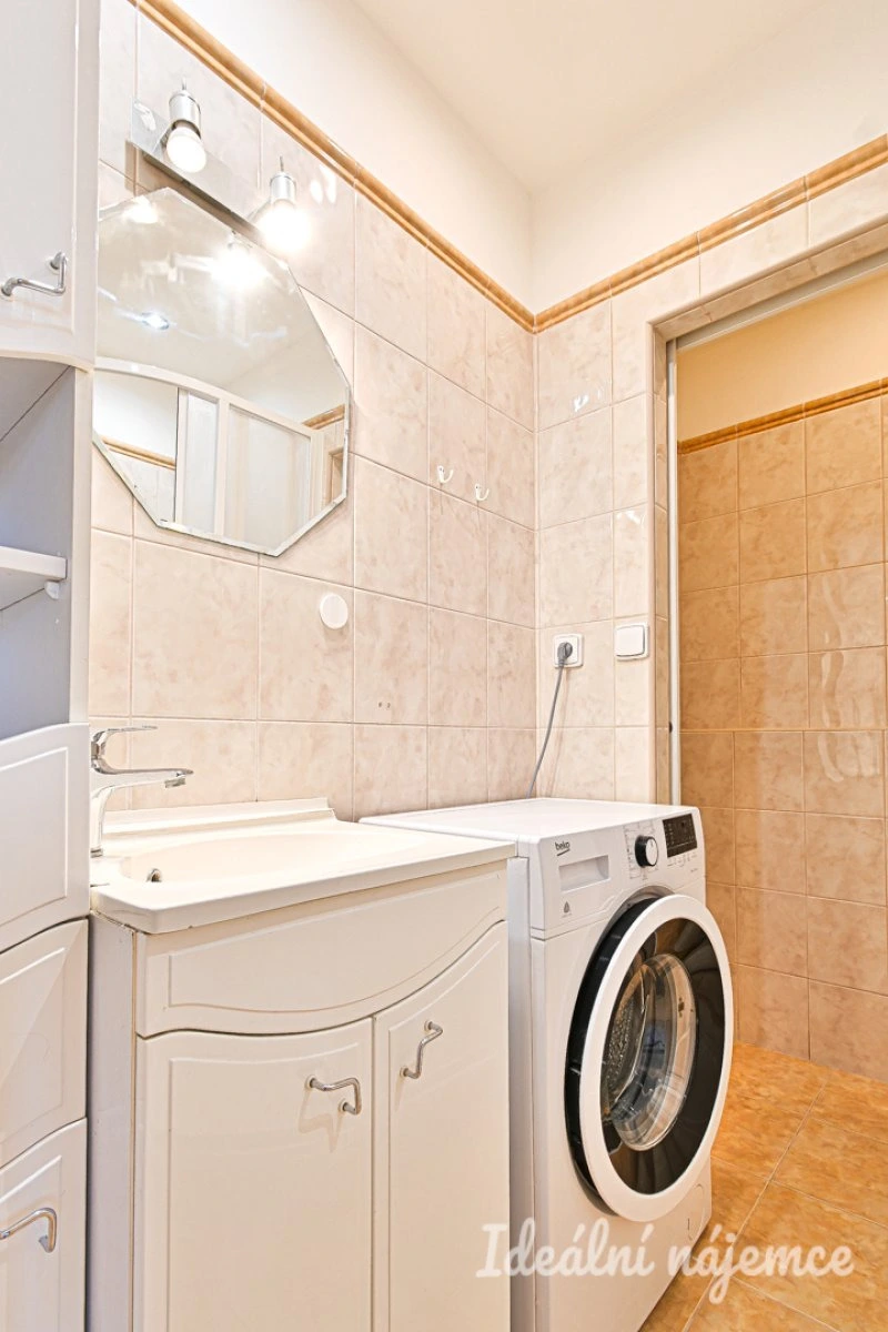 Byt se nabízí vybavený dle fotografií. V kuchyňském koutě najdeme vestavěnou lednici, sporák, troubu, digestoř a mikrovlnnou troubu zbytek kuchyně je vybaven jídelním stolem a židlemi. Hlavní místnost je vybavena TV stolkem, menším gaučem, konferenčním stolkem, manželskou postelí a psacím stolem. V koupelně je sprchový kout, umyvadlo se skříňkou, pračka. Toaleta je oddělená.