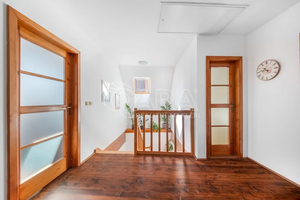 2. NP hala (10 m2), tři pokoje (18,3 m2, 18,2 m2, 14,3 m2), koupelna s vanou a WC, šatna, půda s úložným prostorem je přístupná z haly po výsuvném žebříku