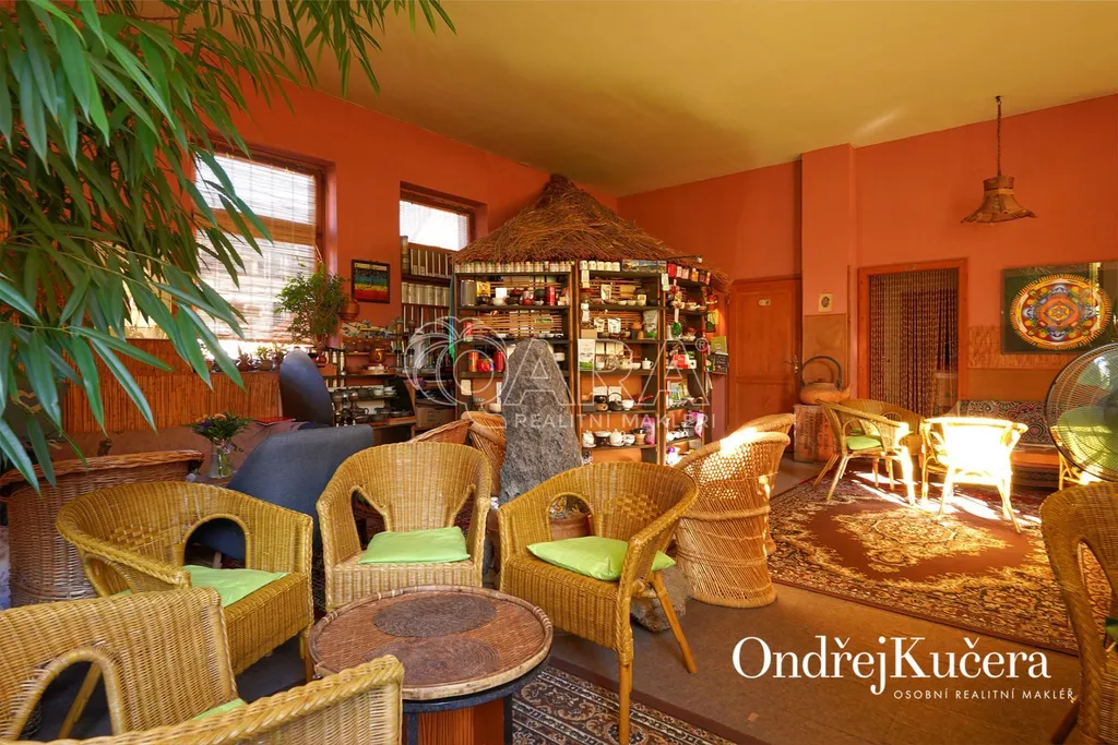 Dům je rozdělen na dvě části. V prvním vchodu se nachází restaurace s potravinami v přízemí. Nad ní je vyhlášená a skvěle hodnocená tradiční čajovna s velkou terasou. V posledním patře je 62 m² byt 2+kk a půda. Ve druhém vchodu je music bar v suterénu, pole gym a 41 m² byt v přízemí. V prvním patře je velký sál s točitým schodištěm do druhého patra s učební a zázemím. Ve druhém patře je i 90 m² byt s dispozicí 3+1. Celkově se jedná přibližně o 1.000 m² s velmi zajímavým uspořádáním.
