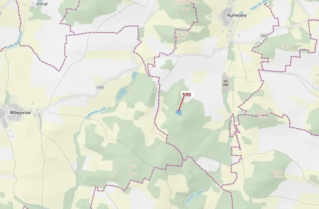 Lesní pozemek o výměře 4807 m2, parcelní číslo 590, podíl 1/1, katastrální území Kuřimany, obec Kuřimany, obec s rozšířenou působností Strakonice, okres Strakonice, Jihočeský kraj. Po těžbě.
