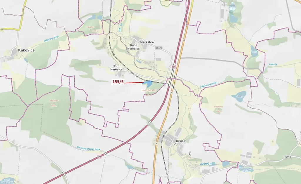 Lesní pozemek o výměře 11 172 m2, parcelní číslo 155/5, podíl 1/1, katastrální území Horní Nerestce, obec Nerestce, obec s rozšířenou působností Písek, okres Písek, Jihočeský kraj. Částečně po těžbě.