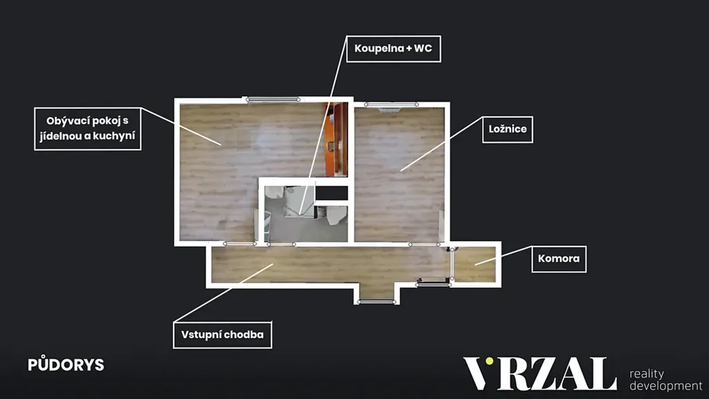 Byt se skládá z obývacího pokoje s kuchyní vybavené kuchyňskou linkou s elektrospotřebiči: el. trouba, varná deska a digestoř. Ze vstupní chodby je přístup do ložnice, dále také do koupelny se sprchovým koutem a toaletou. V neposlední řadě je v bytě k dispozici komora, kterou lze využít třeba jako šatnu nebo úklidovou komoru.