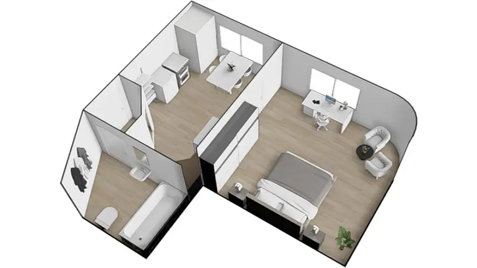 Vstupními dveřmi vejdeme do bytu a ocitneme se v předsíni o výměře cca 1,62 m2. Kuchyně o velikosti cca 12,10 m2 je vybavena kuchyňskou linkou, lednicí, mikrovlnnou troubou a sporákem. U kuchyňské linky je přívod na pračku. Součástí kuchyně je spíž s regálem, pro úschovu například suchých potravin, spíž má výměru cca 0,66 m2. Z kuchyně dále vejdeme do hlavní obytné části o výměře 17,00 m2. Jedná se o atypický a moc pěkný pokoj. Koupelna o výměře cca 3,50 m2 je spojená s WC. Její součástí je vana, umyvadlo, zrcadlo a plynový ohřívač na teplou vodu.