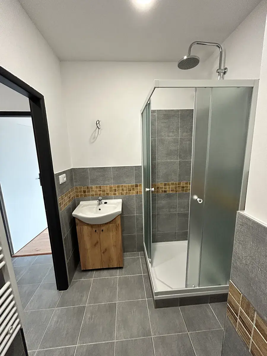 Koupelna: Moderní koupelna se sprchovým koutem (bude ještě doplněna o nové zrcadlo).