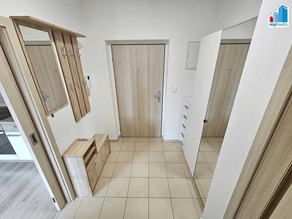 Dispozice bytu zahrnuje předsíň, obytný pokoj s kuchyňským koutem vybaveným moderní kuchyňskou linkou s elektrickou troubou a varnou deskou, komoru a prostornou koupelnu s vanou a toaletou.
