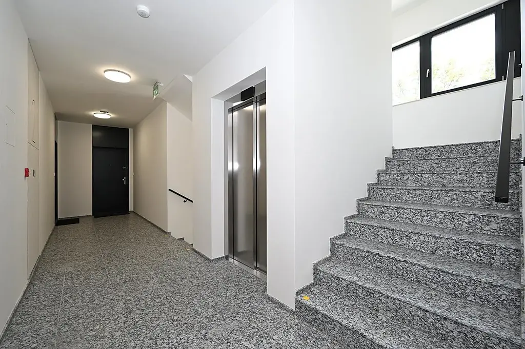 Pronájem moderního tichého bytu 2+kk 58 m2 s jihovýchodní orientací, jižní krytou terasou 12 m2, na východ orientovanou ložnicí, vše dostupné z centrální haly. Stejně tak koupelna s oddělenou toaletou.