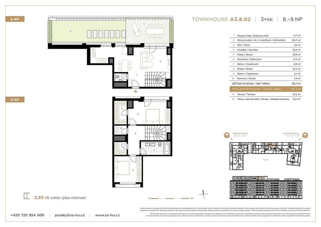 Atraktivní střešní mezonetový townhouse s klimatizací o dispozici 3+kk (105,3 m²) se nachází v 8. a 9. nadzemním podlaží moderní novostavby 2. etapy projektu SO-HO Rezidence v jižní části Holešovic. Tento výjimečný prostor nabízí velkorysý, světlý obývací prostor s kuchyní a jídelnou, který plynule navazuje na soukromou terasu (21,2 m²) se střešní zahradou (35,1 m²) – ideální místo pro relaxaci i společenská setkání vysoko nad městem. Dispozice zahrnuje hlavní ložnici doplněnou o velkorysou šatnu a další pokoj vhodný jako dětský pokoj, pracovna nebo pokoj pro hosty.
