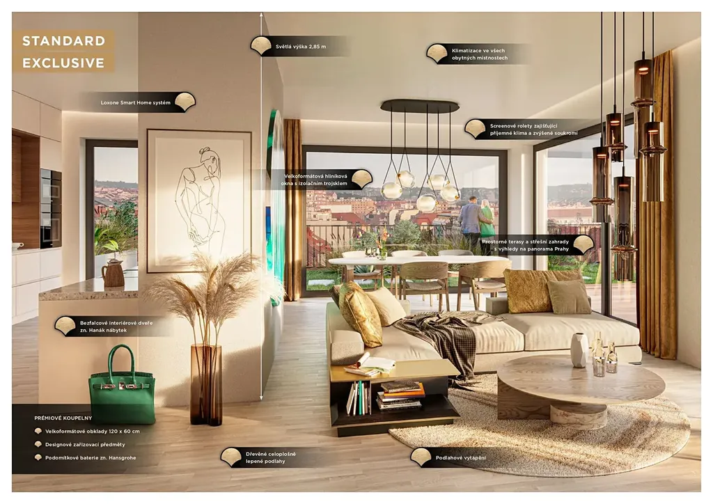 Townhouse vyniká moderním designem od renomovaného architektonického studia QARTA Architektura, které klade důraz na kvalitu, funkčnost a precizní detaily. Interiér je vybaven exkluzivním standardem: klimatizací, dvouvrstvými dřevěnými podlahami v pokládce Chevron 45°, podlahovým topením, bezfalcovými dveřmi s výškou 2,1 m, velkoformátovými hliníkovými okny s izolačním trojsklem a elektricky ovládanými předokenními screenovými roletami. K bezpečnosti přispívají vstupní dveře 3. bezpečnostní třídy. V koupelně najdete velkoformátové obklady a dlažby a podomítkové matně černé baterie. Na přání je možné vybavení bytu nebo jeho dispozici individuálně přizpůsobit v rámci klientských změn.