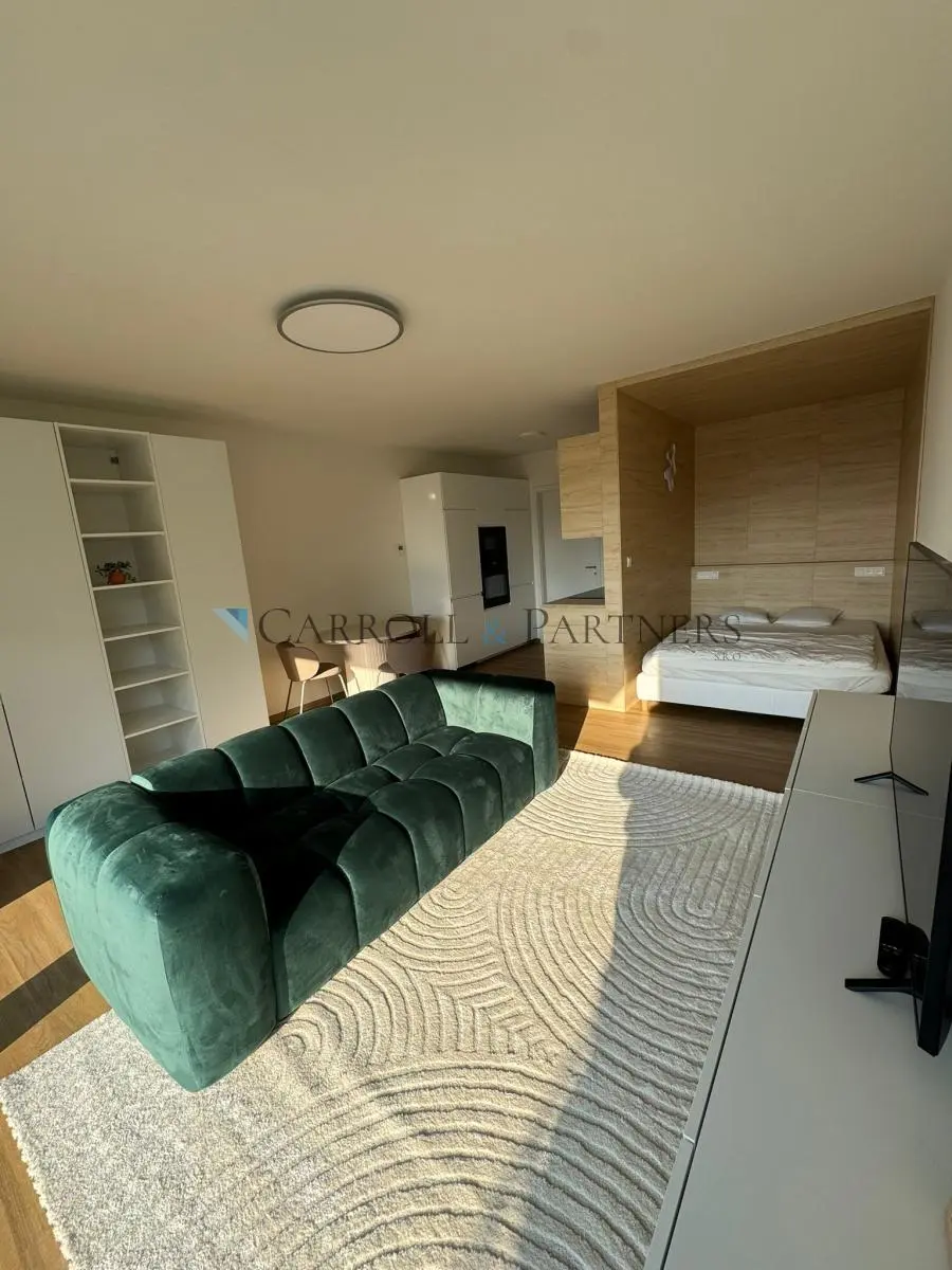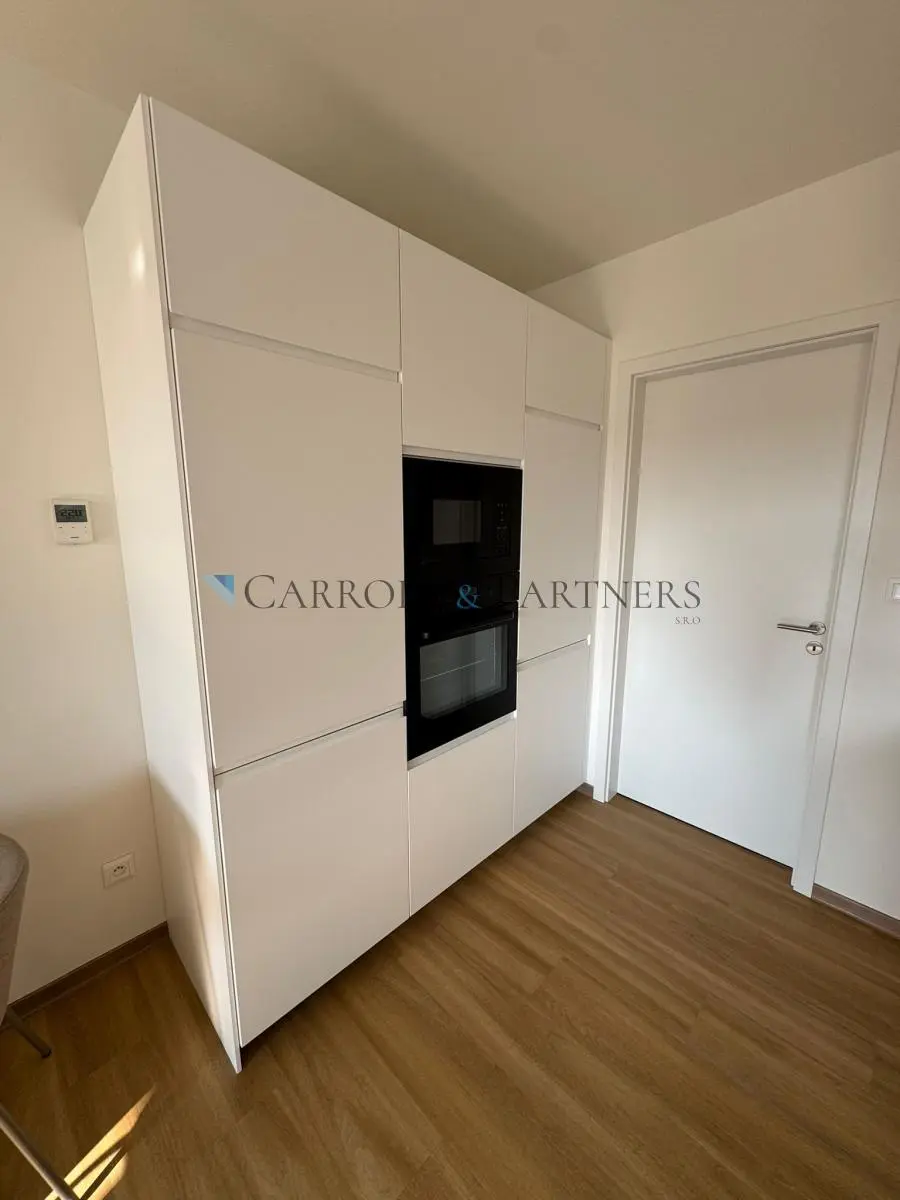 Designová kuchyňská linka je vybavena vestavěnými spotřebiči - varnou deskou, troubou, mikrovlnnou troubou, lednicí a myčkou. Součástí interiéru je rozkládací jídelní stůl s židlemi, úložná prostorná sestava skříní v místnosti, sedací gauč, stolek s televizí, koberec a pohodlná postel o šířce 160 cm v oddělené spací části. A toto vše si můžete užít i se vstupem na terasu přímo z bytu.