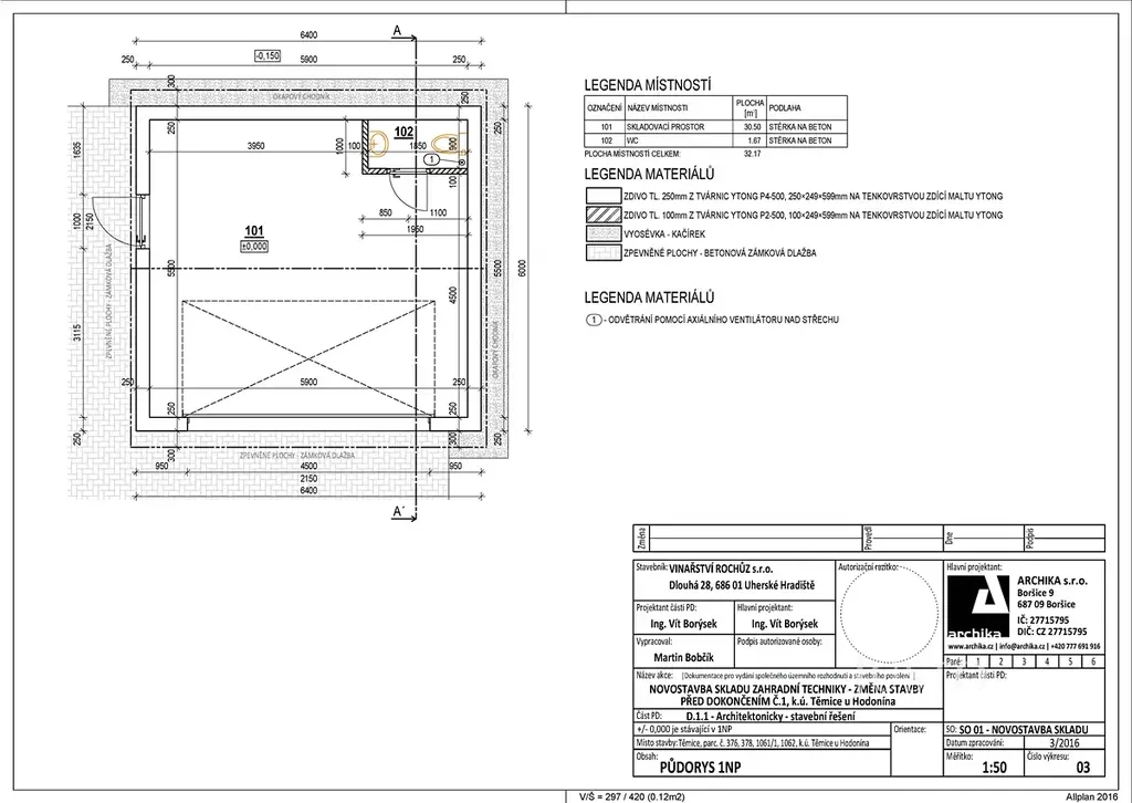 - Konstrukce: Ytong tl 250 mm, vazníkový krov, sedlová střecha s plechovou krytinou
