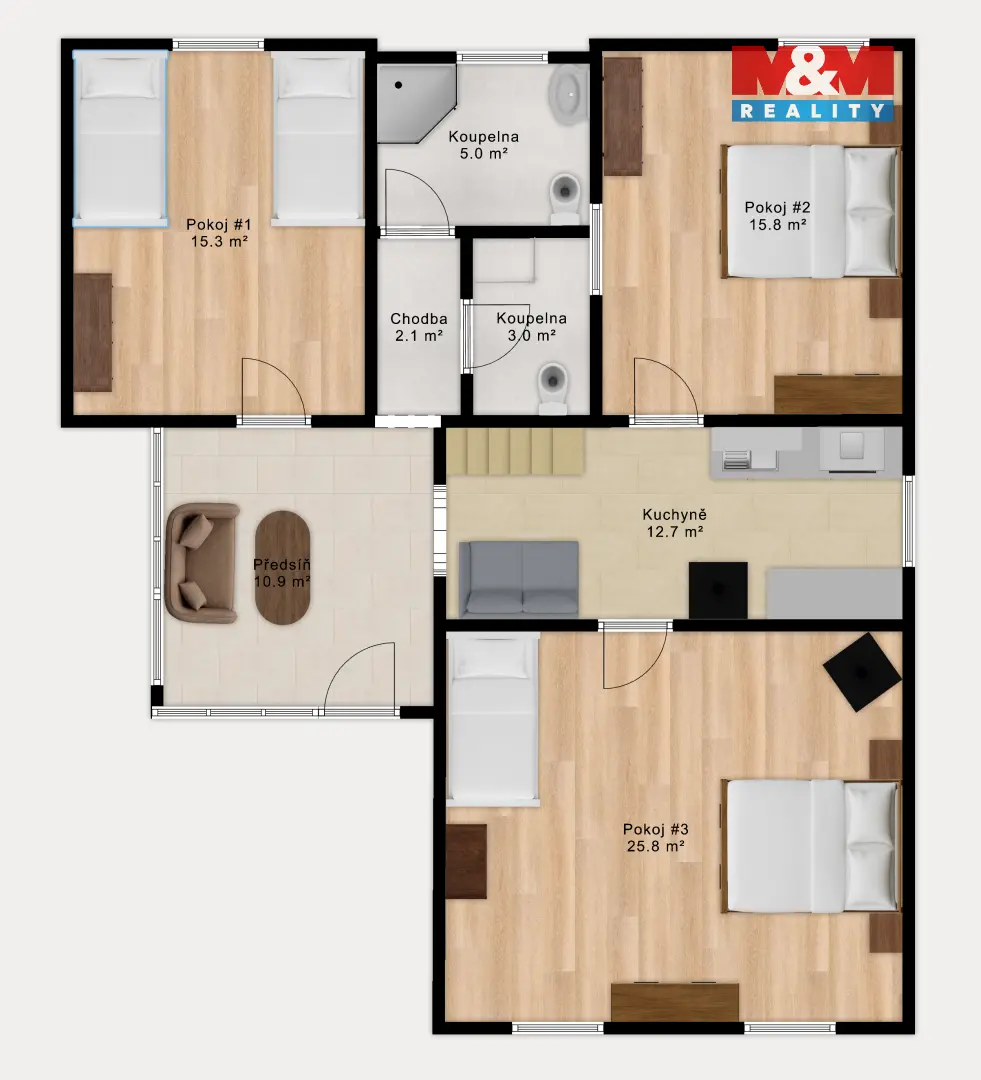 Dispozici tvoří přízemí s prosklenou předsíní, třemi pokoji, dvěma koupelnami se sprchovým koutem, toaletou a kuchyní. V podkroví se nachází jeden pokoj, koupelna se sprchovým koutem, záchodem a vstupem do nedokončené části podkroví, kterou si můžete upravit podle svých představ.