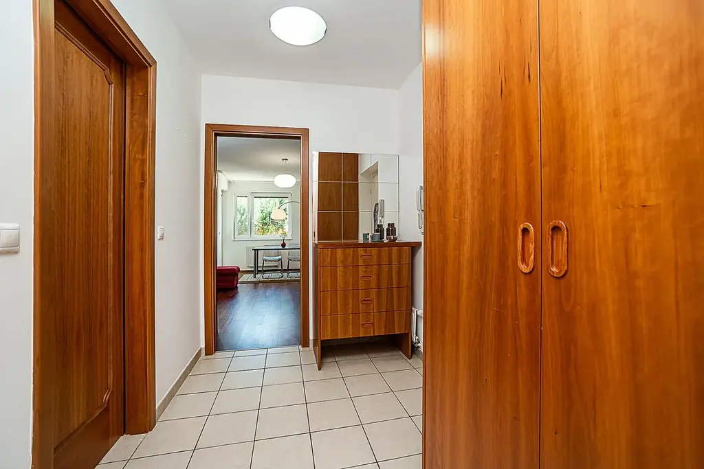 Uprostřed bytu je chodba s vchody do koupelny, ve které je vana, WC a je zde i pračka. Dále se odtud dostanete do praktické komory, která slouží jako neocenitelný úložný prostor.