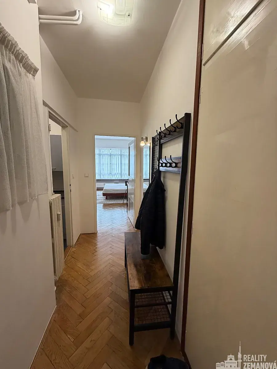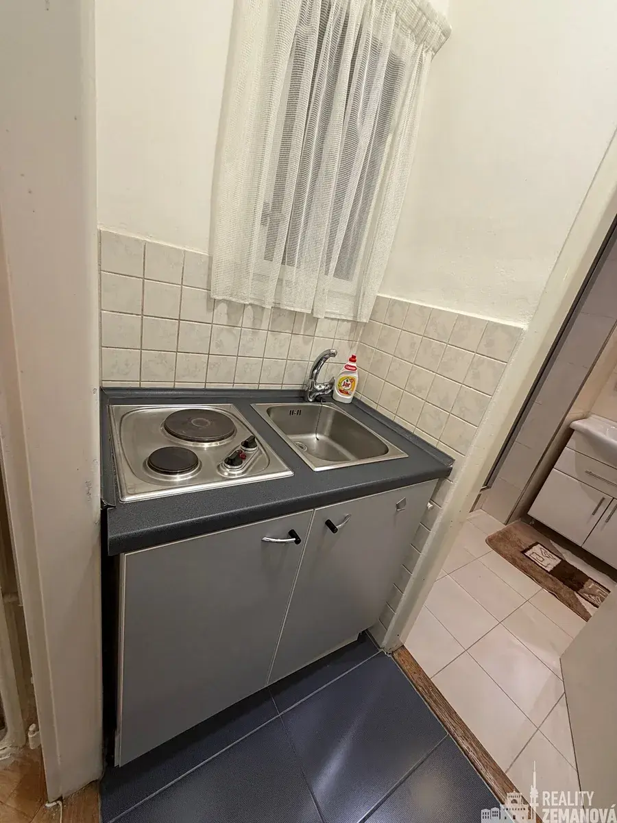 Dispozici bytu orientovaného do ulice tvoří vstupní chodba se vstupy do prostorného pokoje a do samostatné mini kuchyně, která je průchozí do koupelny se zděným sprchovým koutem, WC a kombi pračkou se sušičkou. Nová okna.