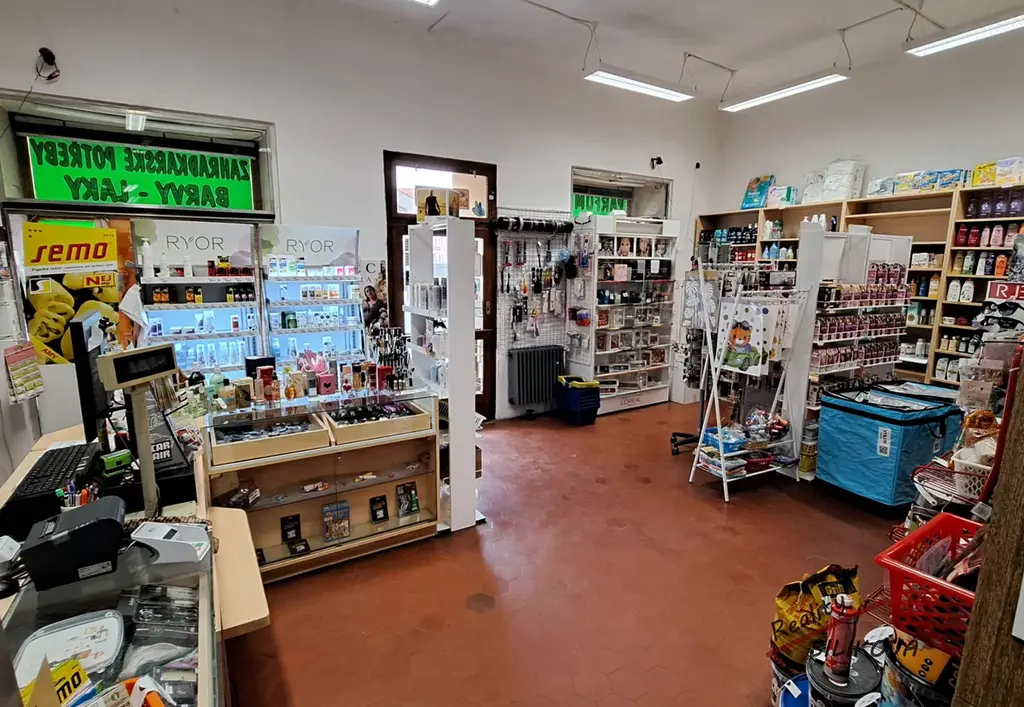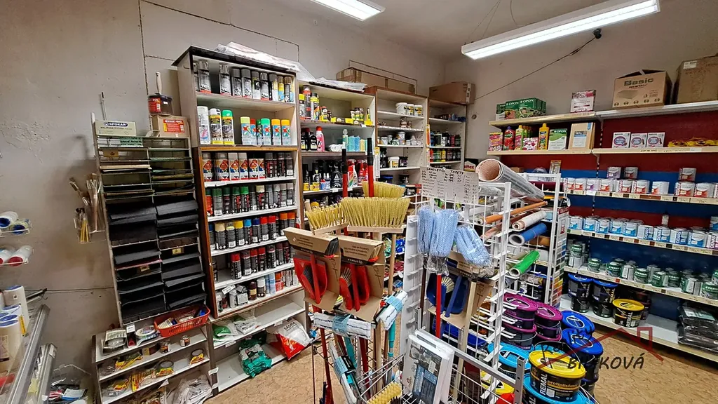 Samotná prodejna je členitá na více místností (37,44m2, 28,9m2, 11,16m2 a 17,85m2 a 2,8m2). Vstup má i z průjezdu domu (pro zaměstnance).