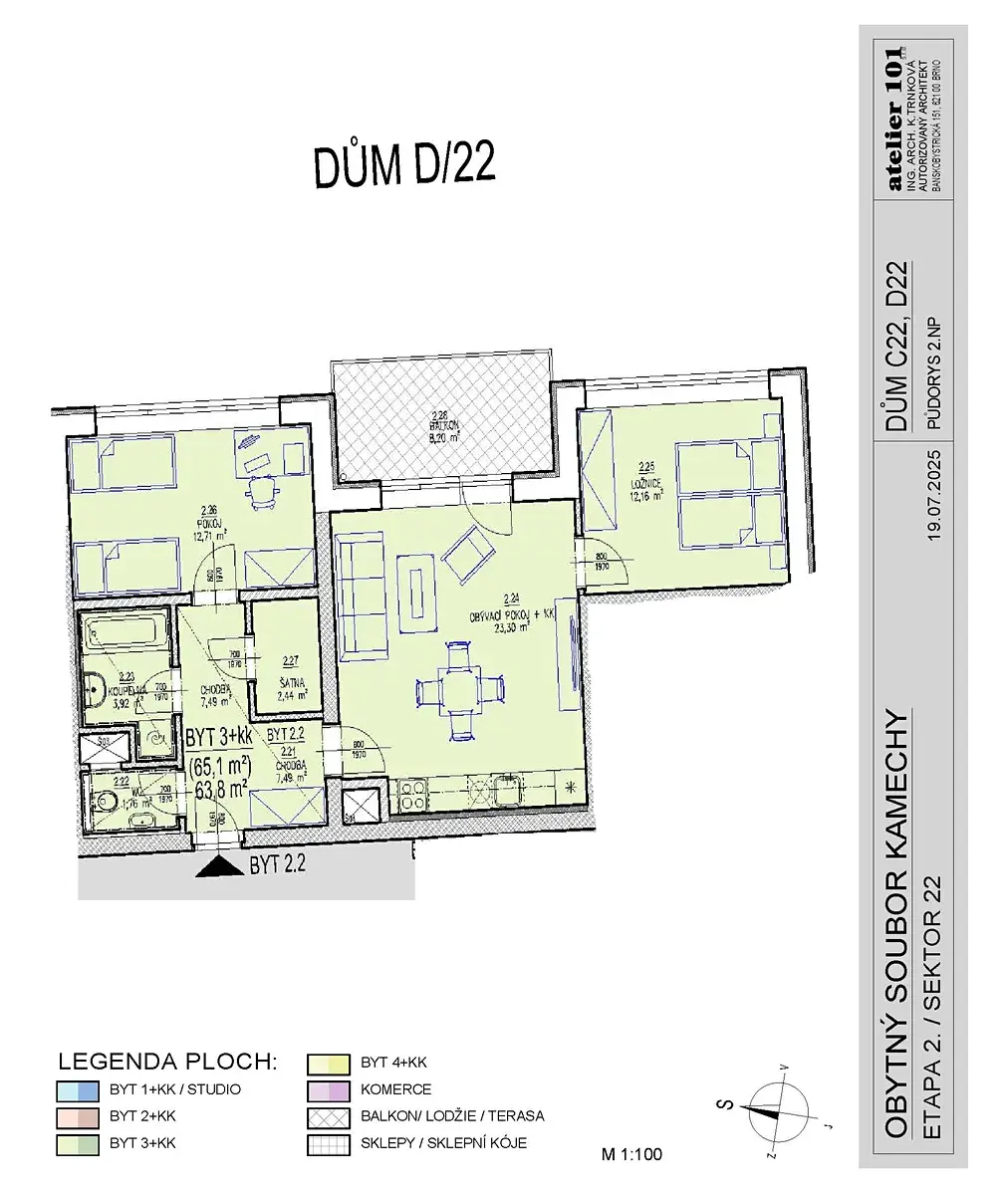Nabízíme k prodeji byt v OV 3+kk č. 2.2. o velikosti 65,10 m2 + balkon 8,20 m2 v poslední výstavbě domu CD22, který Vám nabídne moderní bydlení v 5ti podlažním cihlovém domě s výtahem v klidné, okrajové části Žebětína navazující na Bystrc.