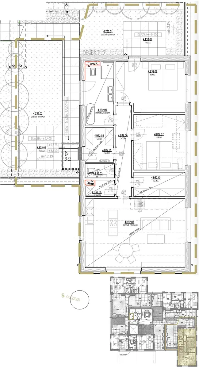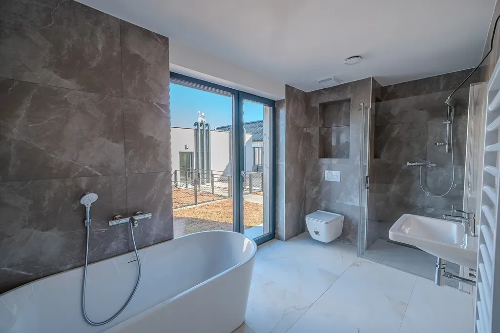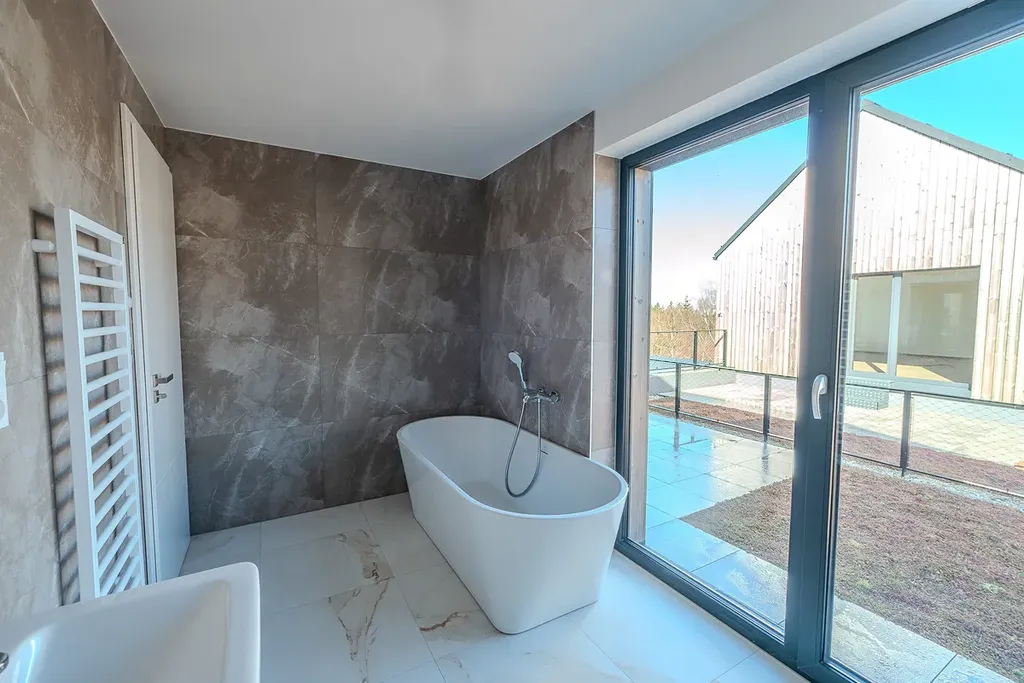 Samozřejmostí je vysoký standard provedení – kvalitní vinylové podlahy s akustickou podložkou, francouzská okna s izolačním trojsklem, moderní koupelny se sanitou Grohe a velkoformátové obklady.