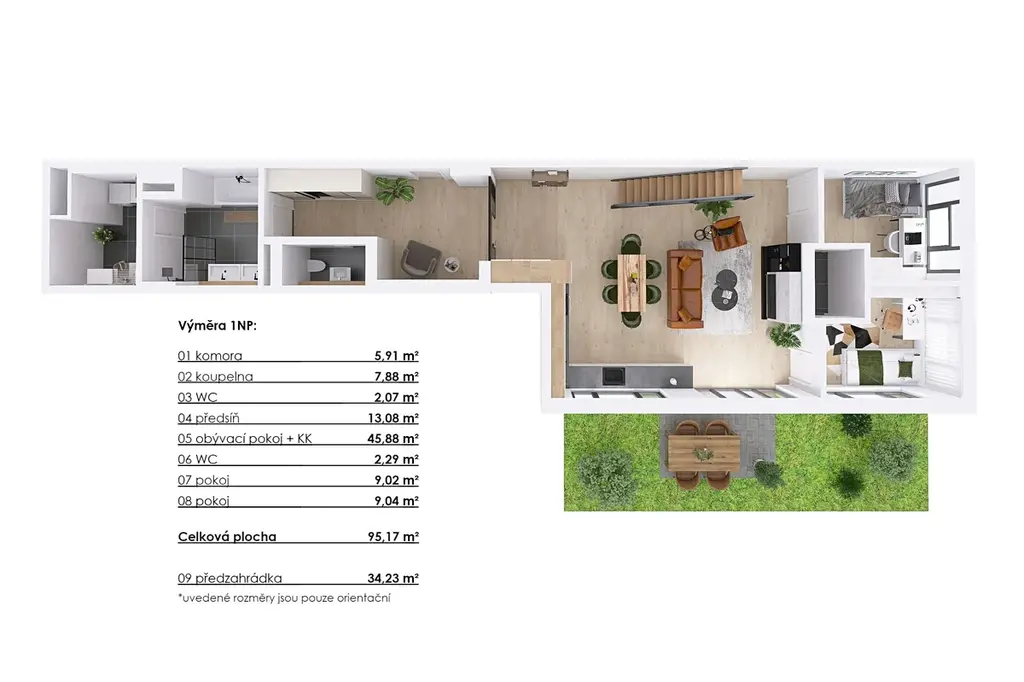 V přízemí se nachází prostorná vstupní chodba, samostatná toaleta, koupelna s vanou i sprchovým koutem a technická místnost. Dominantou podlaží je velkorysý otevřený prostor připravený pro kuchyňskou linku s jídelní a obývací částí. Dále jsou zde dva samostatné pokoje vhodné jako ložnice, pracovna nebo dětské pokoje.