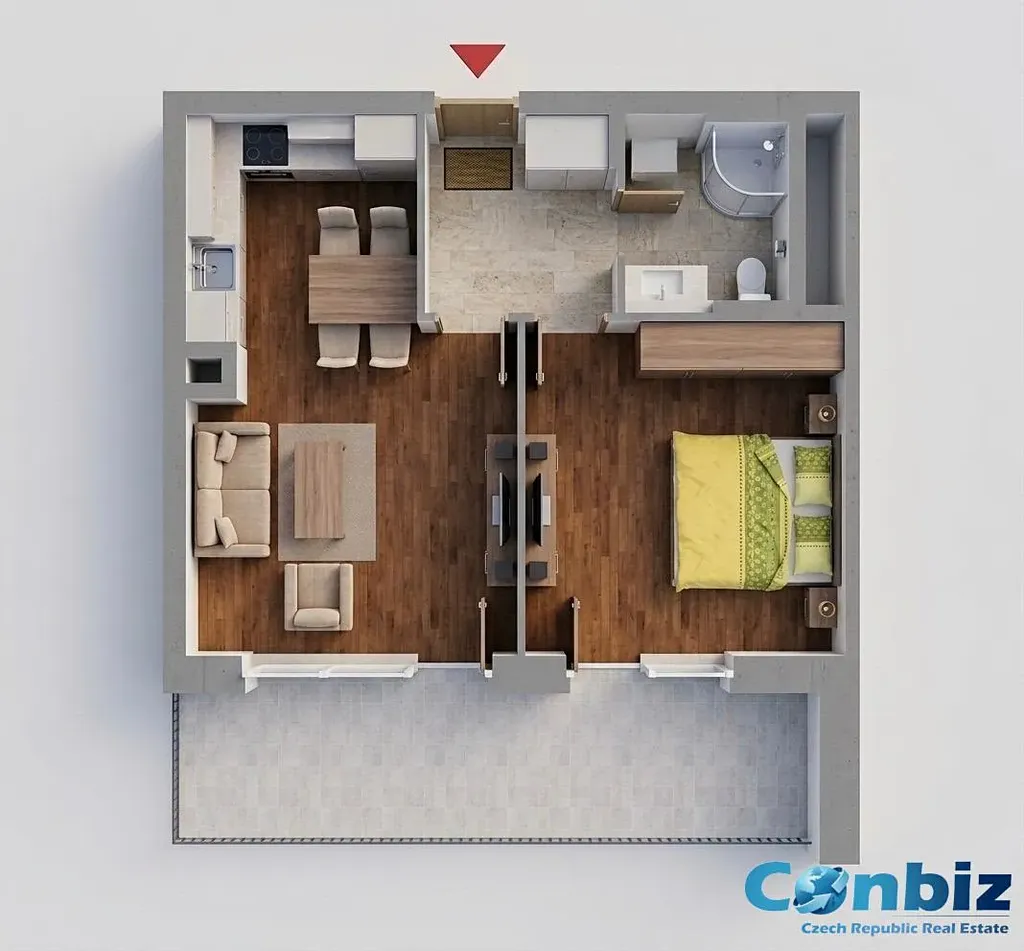 Interiér bytu zahrnuje obývací pokoj s moderní kuchyní značky Gorenje, útulnou ložnici, koupelnu se sprchou a toaletou, a předsíň. Balkón je přístupný z obou pokojů.