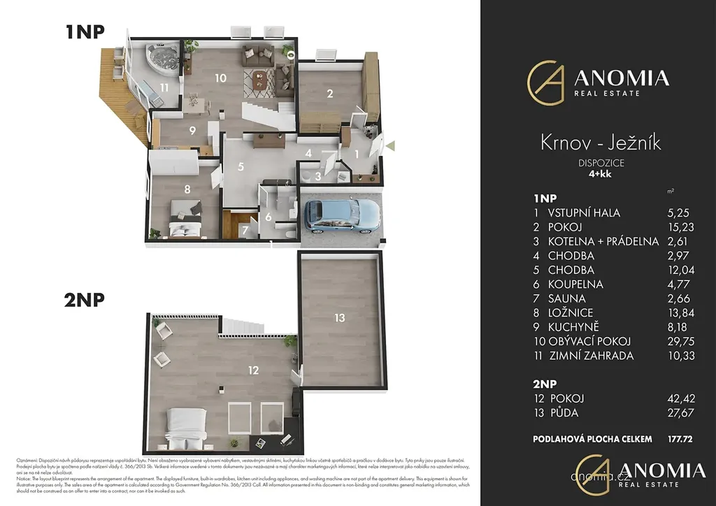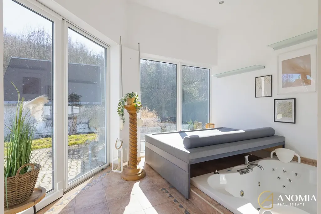 Z obývací části vede schodiště do horního patra, které může sloužit například jako ložnice, pracovna nebo pokoj pro hosty a je propojeno s galerií otevřenou do obytného prostoru. K dispozici jsou také další dva samostatné pokoje. Součástí domu je koupelna s finskou saunou a nechybí ani relaxační místnost s vířivkou, odkud se díky velkým francouzským oknům otevírá příjemný výhled do zahrady. Praktickým zázemím domu je také technická místnost v přízemí a půdní prostor v patře, který nabízí další úložné možnosti.