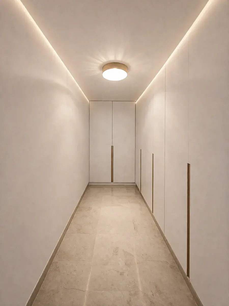 Použité materiály splňují vysoký standard kvality a podtrhují luxusní charakter interiéru. Podlahy tvoří prémiové dřevěné parkety v kombinaci s velkoformátovou dlažbou, které dodávají prostoru eleganci a harmonii. Součástí bytu je také praktická komora, která poskytuje dostatek úložného prostoru.