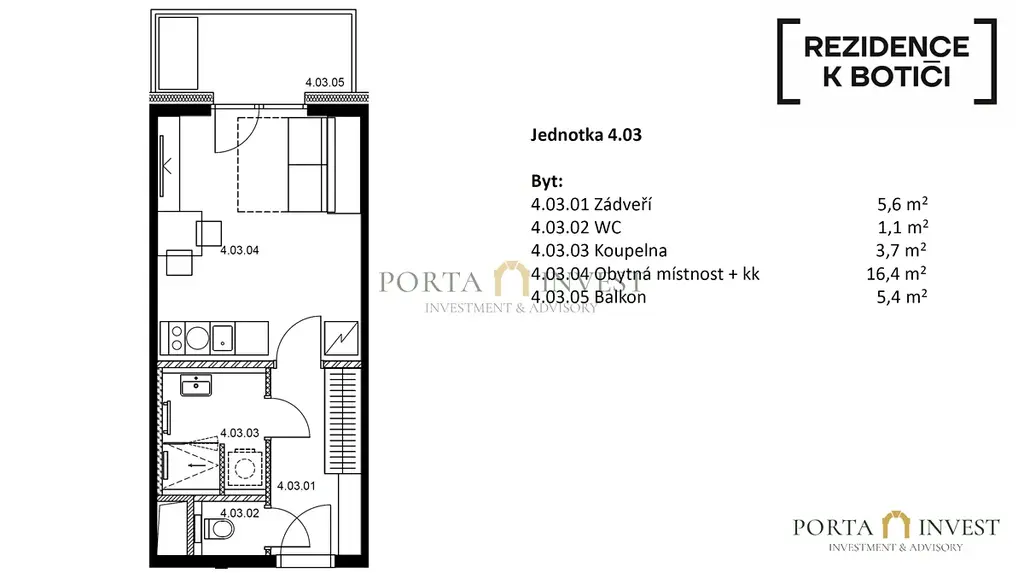 Vítejte v Rezidenci K Botiči. Jako developer vám nabízíme byt 1+kk (28,6 m²), který má atmosféru butikového hotelu. Není to jen bydlení, je to vaše soukromá oáza klidu. Z balkonu (5,4 m²) se díváte do zeleně parku – ideální místo na ranní espresso nebo večerní sklenku vína při šumění potoka.