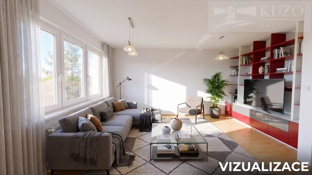 Důležité k fotodokumentaci: Fotografie označené nápisem „VIZUALIZACE“ slouží pro lepší představu o možnostech uspořádání nábytku a potenciálu prostoru. Ostatní fotografie věrně zachycují aktuální stav bytu.