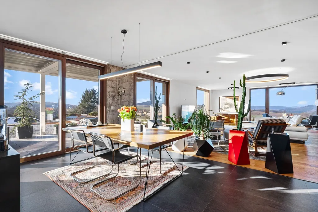 Nabízíme k prodeji výjimečný moderní rodinný dům, situovaný v obci Tmaň, blízko města Králův Dvůr, v klidném prostředí s dostatkem soukromí a dobrou dostupností do Berouna i Prahy. Dům o celkové vnitřní užitné ploše 294 m² je umístěn na pozemcích o celkové výměře 1 634 m², které poskytují nadstandardní prostor pro rodinné bydlení, relaxaci i další rozvoj. Z domu a pozemku se otevírají jedinečné, ničím nerušené panoramatické výhledy na ikonické dominanty Českého krasu – masiv Kotýzu, vrch Zlatý kůň a skalní útvar Aksamitova brána, které dodávají místu výjimečnou atmosféru a prestiž.