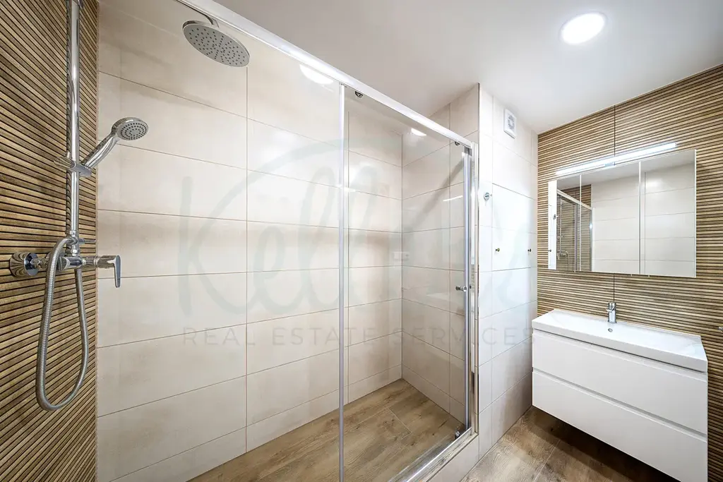 Byt o celkové podlahové ploše 93,43 m² se nachází v 6. nadzemním podlaží udržovaného panelového domu s výtahem. Velkým benefitem je promyšlené dispoziční řešení – dvě neprůchozí ložnice zajišťují dostatek soukromí, zatímco obývací pokoj s kuchyňským koutem tvoří přirozené centrum bytu. Jednotka nabízí nadstandardní množství úložných prostor – k dispozici jsou dvě vestavěné skříně, samostatná šatna i praktická komora. Součástí pronájmu je i sklep.