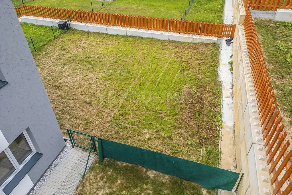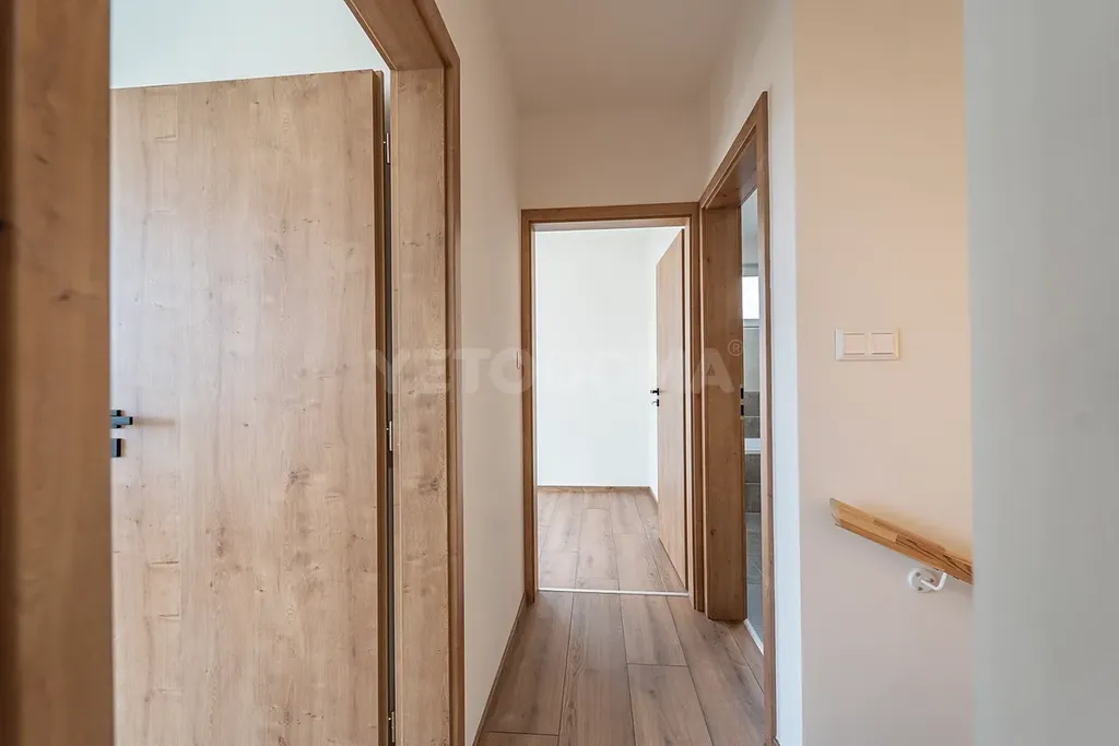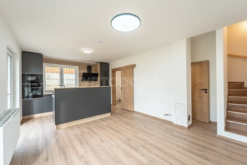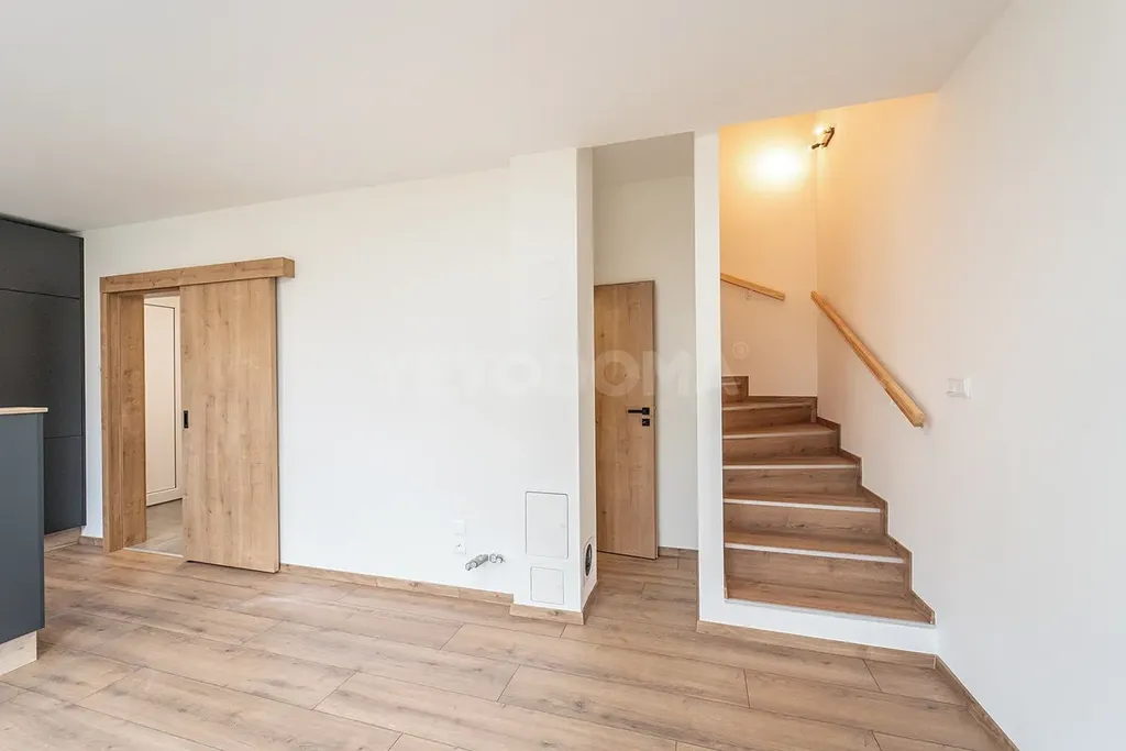 V dolním podlaží je toaleta, technická místnost a prostorný obývací pokoj s kuchyní a vstupem na vlastní zahradu o rozloze 155 m2. V horním patře jsou dva pokoje s balkonem, šatnou a koupelnou.