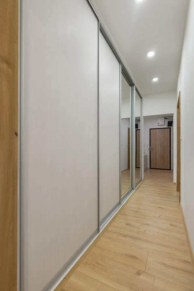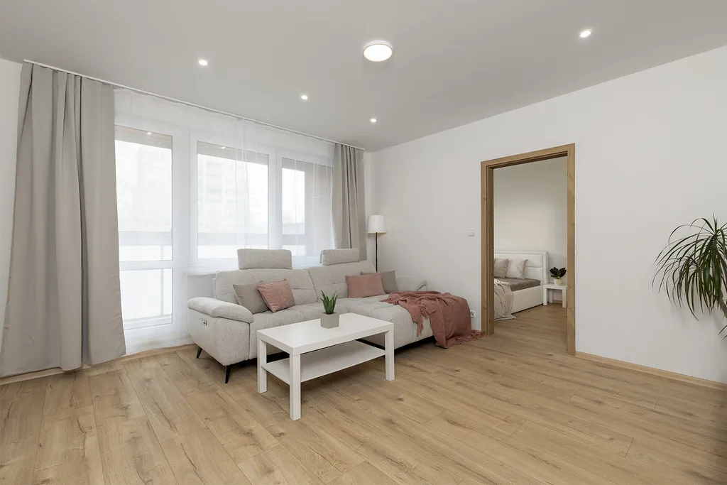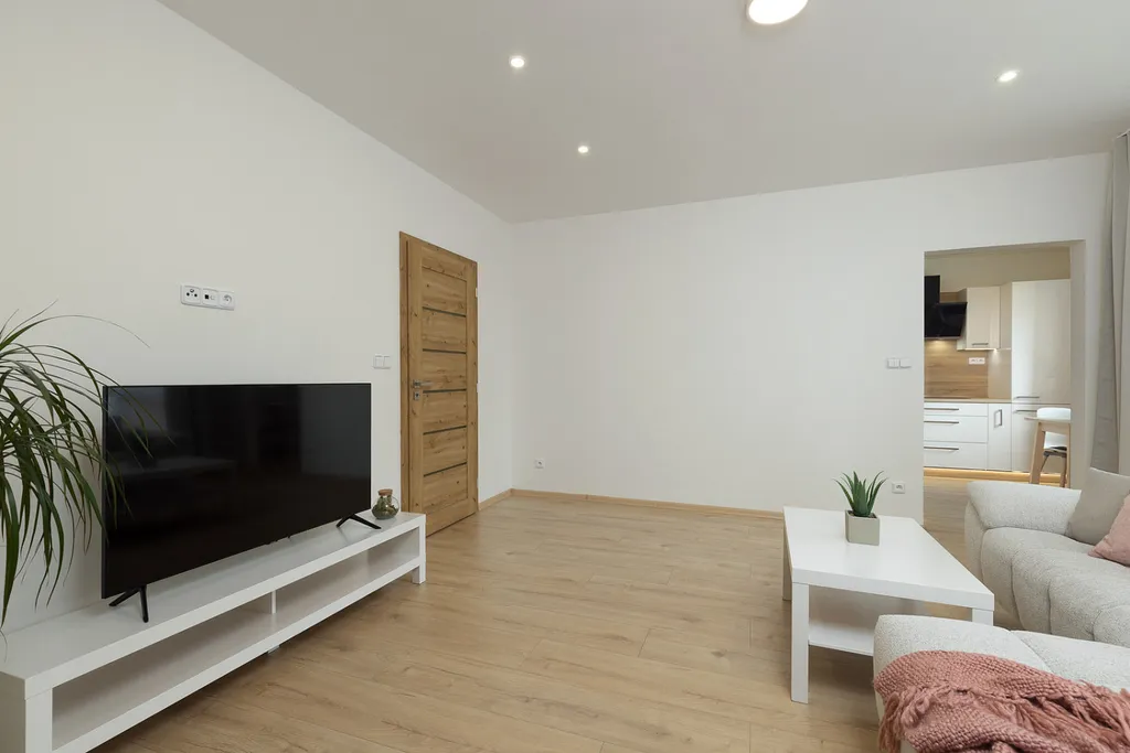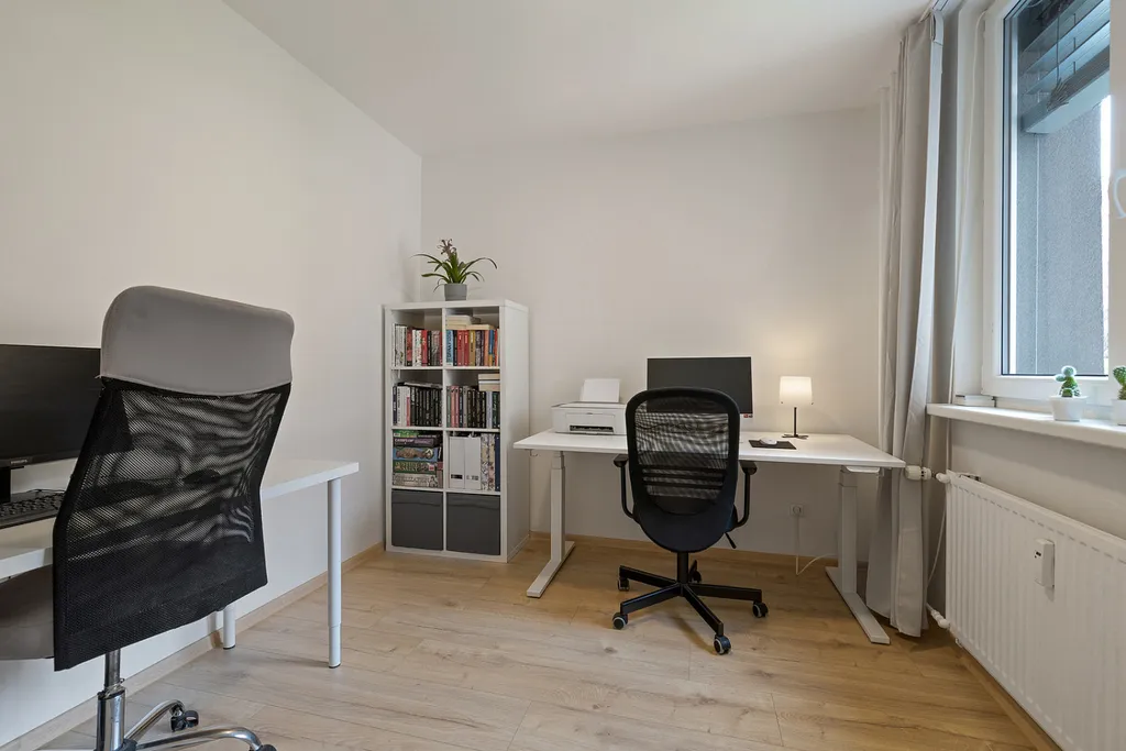Bytová jednotka prošla v roce 2025 kompletní rekonstrukcí a nabízí moderní, čisté a praktické bydlení bez nutnosti dalších investic. Dispozice tvoří vstupní chodba s prostornými vestavěnými skříněmi, nadstandardně řešená koupelna s dostatkem místa pro pračku i sušičku, dále obývací prostor propojený s kuchyní vybavenou veškerými spotřebiči, samostatná ložnice a pracovna, která může sloužit také jako dětský pokoj nebo pokoj pro hosty.
