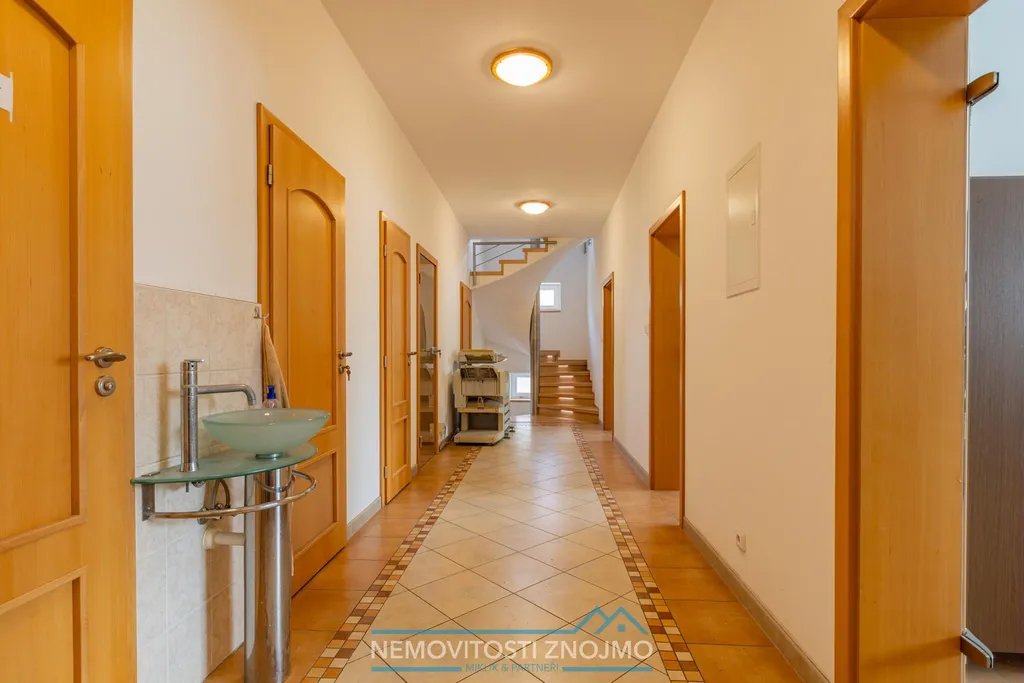 V 1. nadzemním podlaží zádveří, tři pokoje, koupelnu, dvě WC, chodbu, schodiště, komoru, halu.