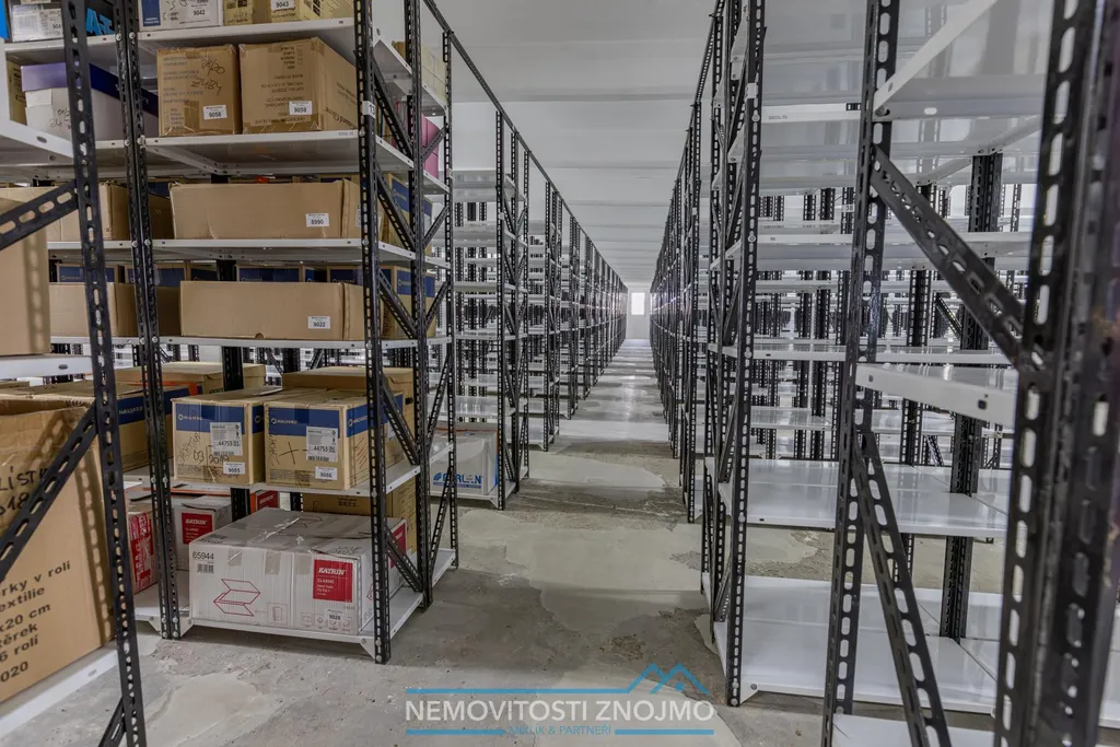 V budově jsou umístěny skladové regály o kapacitě 16000 m (je možné odkoupit i s nemovitostí) a lze je rozšířit až na 18000-20000 m.