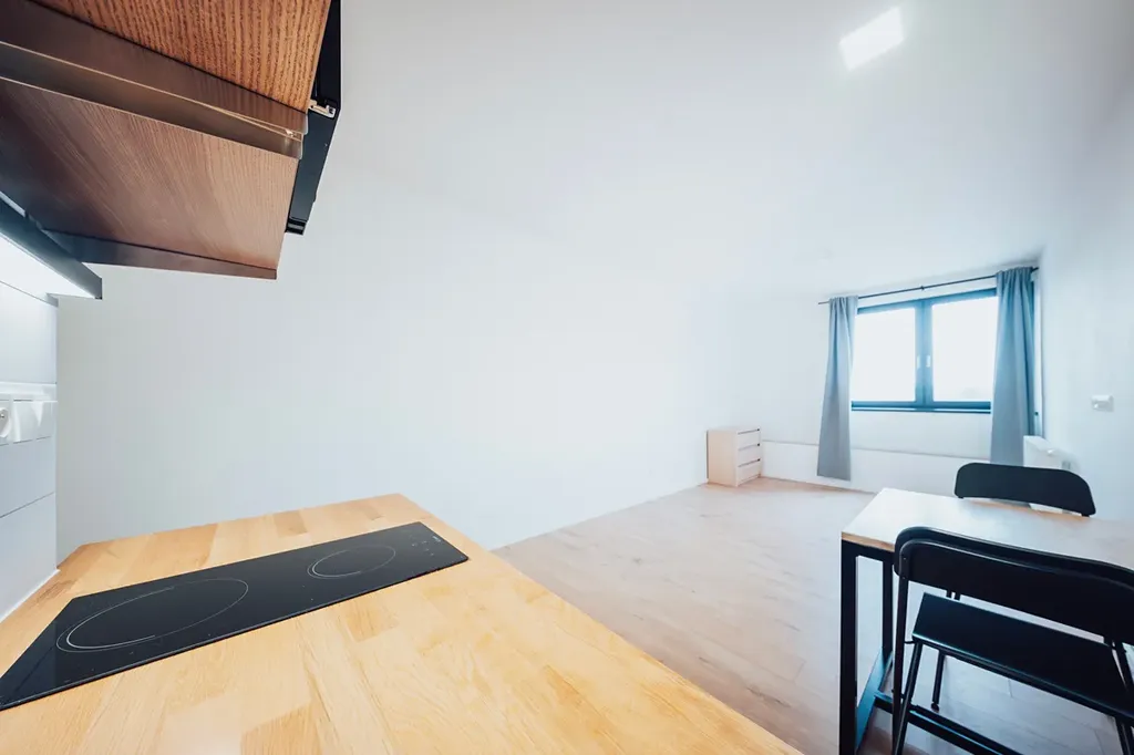 Byt je situován v 1. patře dvoupodlažního víceúčelového domu bez výtahu a je okamžitě volný k nastěhování. Bytová jednotka se sestává z prostorného pokoje s kuchyňskou linkou a koupelny se sprchovým koutem. Kuchyňská linka je vybavena elektrickým indukčním dvouplotýnkovým vařičem, dřezem a mikrovlnnou troubou. Pod linkou je potom samostatně stojící lednice. Byt je částečně vybaven nábytkem, což novým nájemníkům umožňuje snadnější nastěhování (viz. foto). Na chodbě je sdílená pračka a sušička pro volné využití.