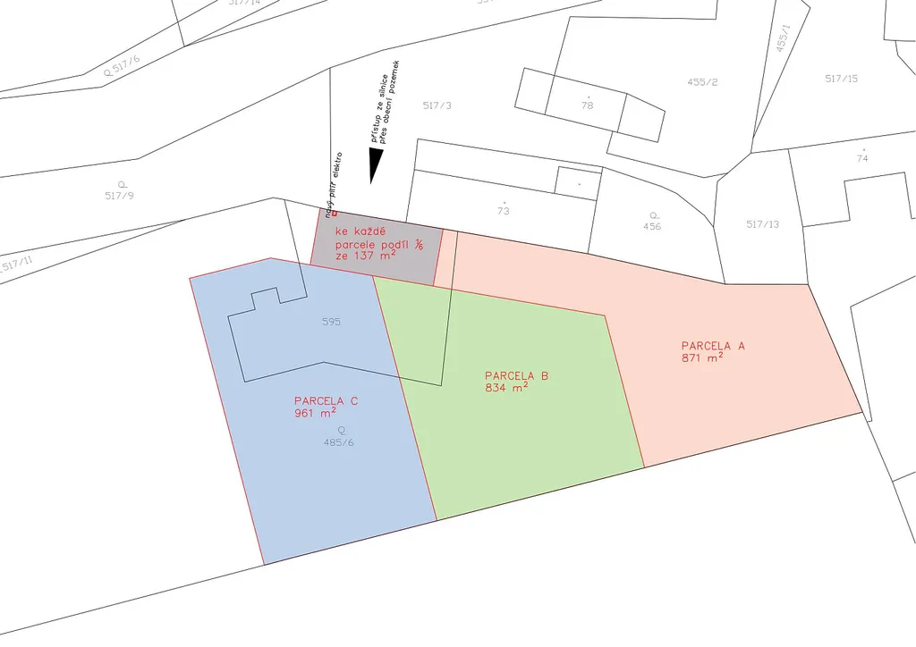 Pozemky jsou již geodeticky zaměřeny a rozděleny na tři samostatné parcely: