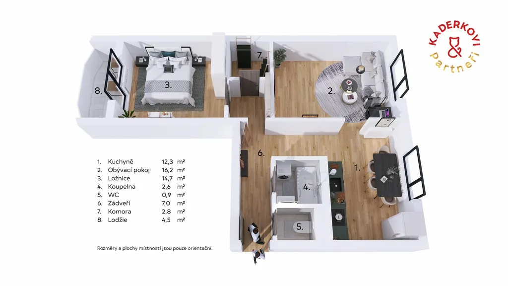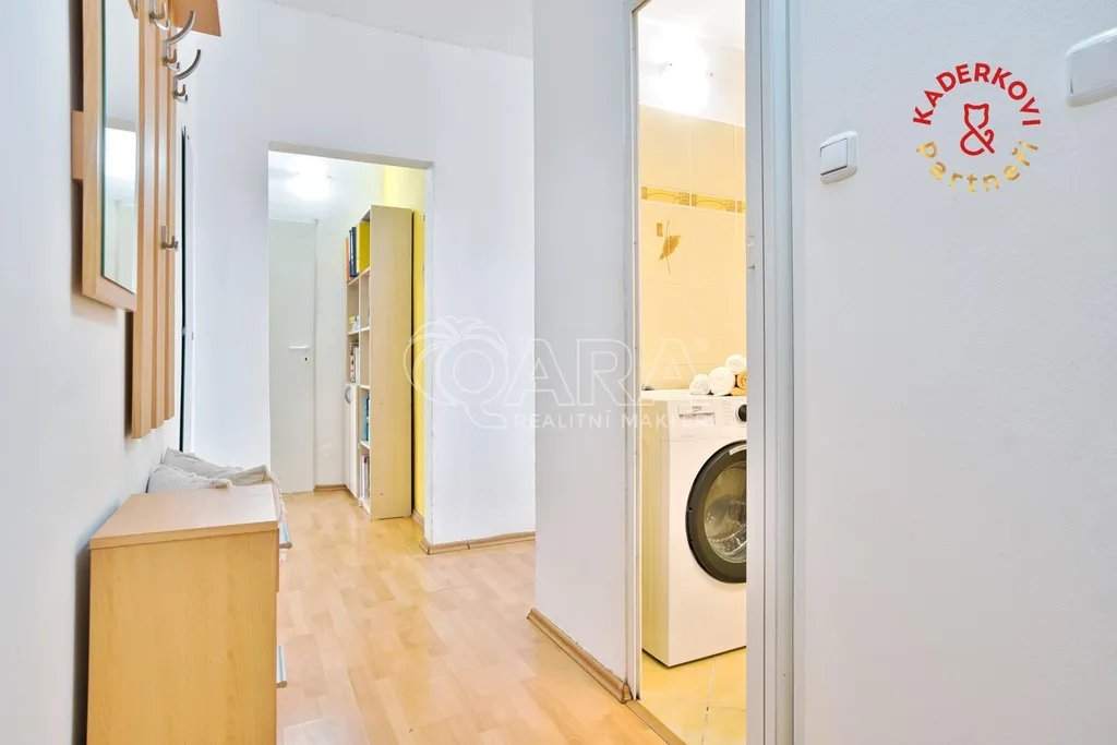 Vedlejší pokoj má přímý vstup na lodžii (cca 4,5 m²) s výhledem na travnatou plochu a klidné náměstí ideální jako ložnice či dětský pokoj. K pohodlí přispívá koupelna s vanou a oddělená toaleta. V bytě se navíc nachází i praktická komora (cca 2,8 m²), která poslouží jako šikovný úložný prostor. K bytu náleží také sklepní kóje (cca 2 m²).