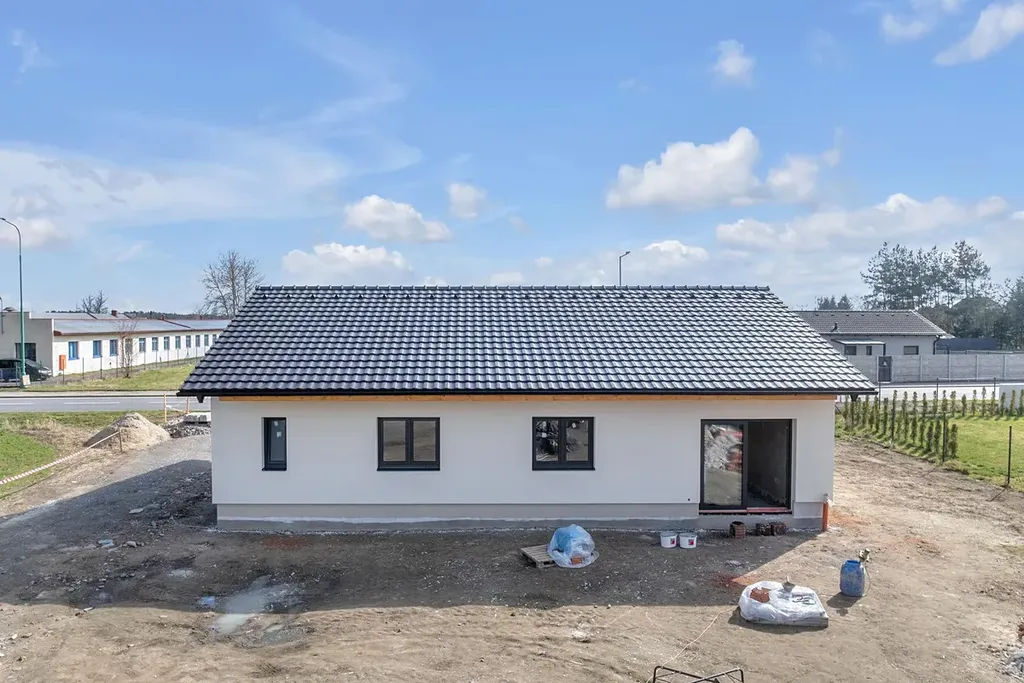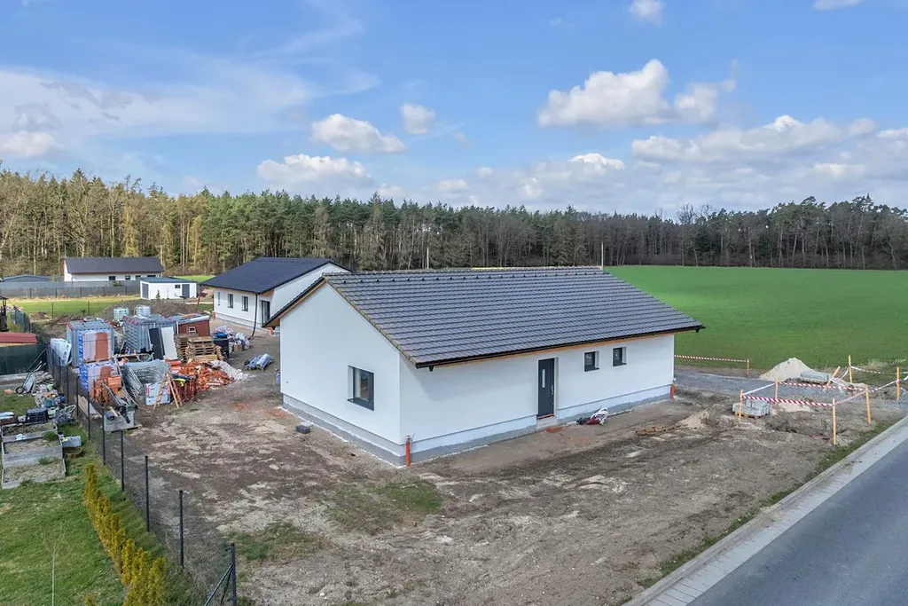 K prodeji je novostavba jednopodlažního rodinného domu (č. 2) ve and #34;městě mezi lesy and #34; - v Horním Jelení. Dům je situován na rovinatém pozemku o výměře 864 m2, v okrajové nově vznikající rezidenční čtvrti, severně od centrální části obce. Rodinný dům je půdorysného tvaru obdélníku s rozměry 14,66 m x 9,11 m. Výška objektu od úrovně 1. NP k hřebenu střechy je 5,5 m. Dům nabízí zastavěnou plochu 133,6 m2, užitnou plochu 104,6 m2 a je dispozičně řešený jako 4+kk. Skrze zádveří je vstup do chodby a následně do obývacího pokoje s kuchyní a jídelnou. Ze vstupní chodby je dále přístupná ložnice s šatnou, pokoj, pracovna, koupelna, technická místnost a WC. Z kuchyně je vstup do spíže. Pozemek bude oplocen. Dům bude předán zkolaudovaný, jeho dokončení je plánováno na červenec 2026. Okna a dveře na terasu jsou plastová s izolačním trojsklem. Střešní krytina je z keramických tašek Tondach. V obytných místnostech budou použity lepené vinylové dílce, v místnostech hygienického zázemí a technické místnosti keramická dlažba. Vnitřní dveře budou dřevěné plné s CPL povrchem osazené do dřevěných obložkových zárubní. Koupelna bude osazena sanitární technikou. Součástí domu při předání nebude kuchyňská linka. Dům je napojen na veřejný vodovod, kanalizaci a elektřinu. Vytápění domu zajistí tepelné čerpadlo vzduch-voda s podlahovým vytápěním. Pozemek je příjemně orientován, v zástavbě nízkopodlažních rodinných domů, s lesem za zády a v obci s dobrou úrovní občanské vybavenosti. Z Horního Jelení jsou skvěle dostupné Holice, Vysoké Mýto, Borohrádek a Choceň. Do 30 min. jste v Hradci Králové. Svou polohou uprostřed lesů láká ke sportu i k procházkám k blízkým rybníkům. Okolní lesy nabízí každoroční bohatou úrodu hub a borůvek.