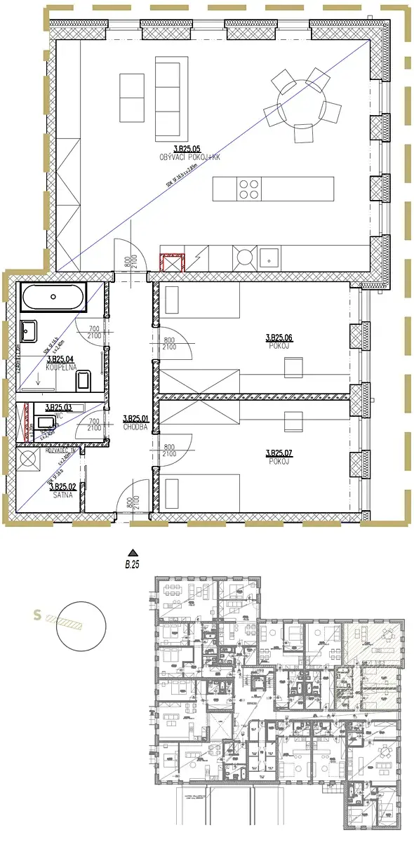 Nabízíme k prodeji nadstandardní byt B25 o dispozici 3+kk a celkové ploše 95,2 m² dle NOZ (čistá užitná plocha 90,9 m²). Byt se nachází ve 3. nadzemním podlaží a je orientován převážně na jihovýchod, což zajišťuje dostatek přirozeného světla po většinu dne. Součástí bytu je také sklepní kóje o velikosti 2 m².