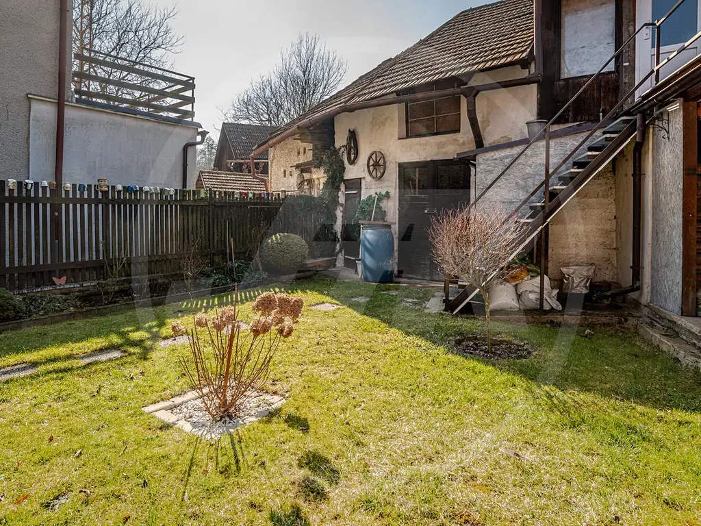 K domu přináleží jak nevelká předzahrádka do ulice, tak i zahradní atrium se zastřešeným venkovním posezením a dalším hospodářským zázemím. To tvoří jednak dílna a sklep a dále různé skladové prostory.
