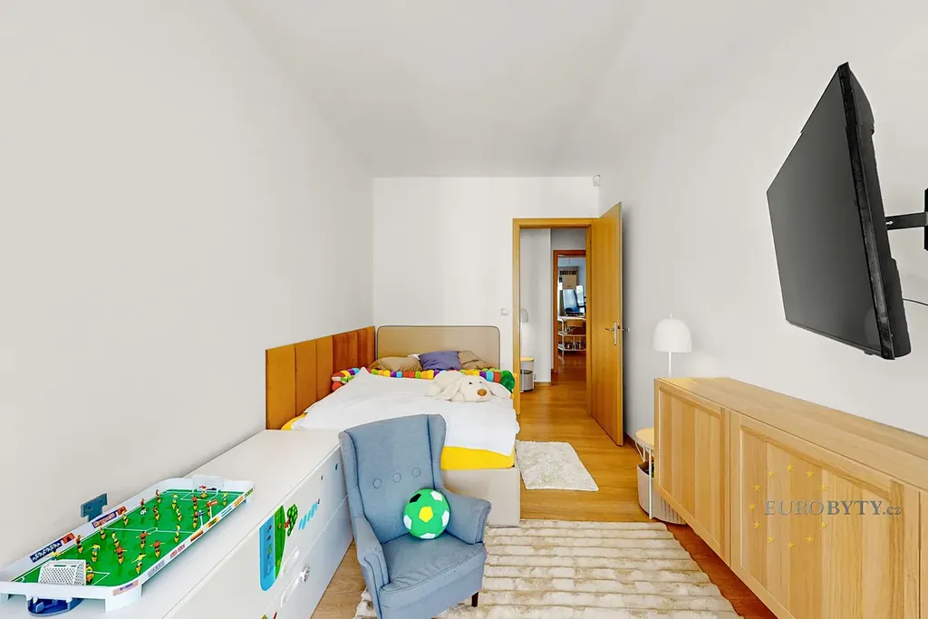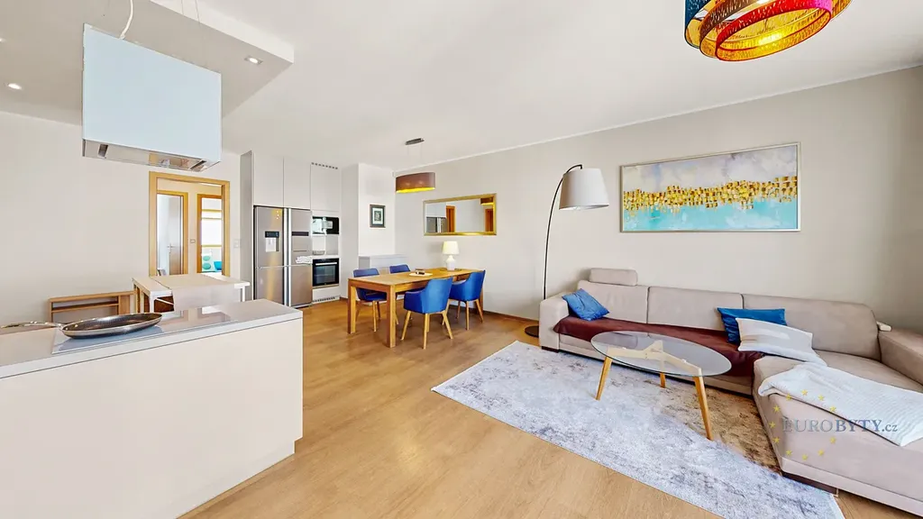 Ve výhradním zastoupení vlastníka si Vám dovolujeme nabídnout pronájem velmi pěkného bytu 4+kk se dvěma balkony a terasou, o celkové výměře cca 133m2, v žádané lokalitě Prahy 4 Podolí. Byt se nachází ve čtvrtém patře (5. NP) novostavby dobře spravovaného bytového domu s výtahem a kamerovým systémem. Dispozičně je byt rozčleněn na předsíň, prostorný obývací pokoj, tři ložnice (1 x se šatnou), dvě koupelny (1 x vana, 1 x sprchový kout) s toaletou, technickou místnost s pračkou a sušičkou a úložnou komoru. K bytu náleží terasa a dva balkony, na které je přístup ze všech obytných místností. Součástí obývacího pokoje je moderní, otevřený kuchyňský kout, který je plně vybaven vestavěnými spotřebiči. Další vybavení bytu na fotografiích (jídelní stůl se židlemi, sedací souprava, postele, komody, osvětlovací tělesa) bylo částečně odstěhováno, ovšem v případě zájmu je možno byt nábytkem opět dovybavit. Klimatizace v ložnici a obývacím pokoji, příjem TV a internetu prostřednictvím kabelové sítě, podlahy plovoucí + dlažba, centrální dálkové vytápění a dodávka teplé vody. Součástí pronájmu jsou i dvě garážová stání v suterénu domu, výhodou je možnost relaxace v upraveném zeleném vnitrobloku s možností posezení. V místě je výborná občanská vybavenost (vše jen pár kroků chůze), jakož i dopravní dostupnost s rychlým spojením do centra města i na Jižní spojku. Ideální pro pro rodinné bydlení, nevhodné pro studentské, či jiné spolubydlení. Preferujeme zájemce o dlouhodobější spolupráci, pokud možno bez velkých domácích zvířat. Cena nájemného byla stanovena ve výši 48.000,Kč/měs. + zálohová platba na zúčtovatelné domovní poplatky cca 7.000,Kč (v závislosti na počtu osob) + převod bytové elektřiny na nájemce. Volný ihned, v případě zájmu o prohlídku neváhejte kontaktovat našeho realitního makléře !