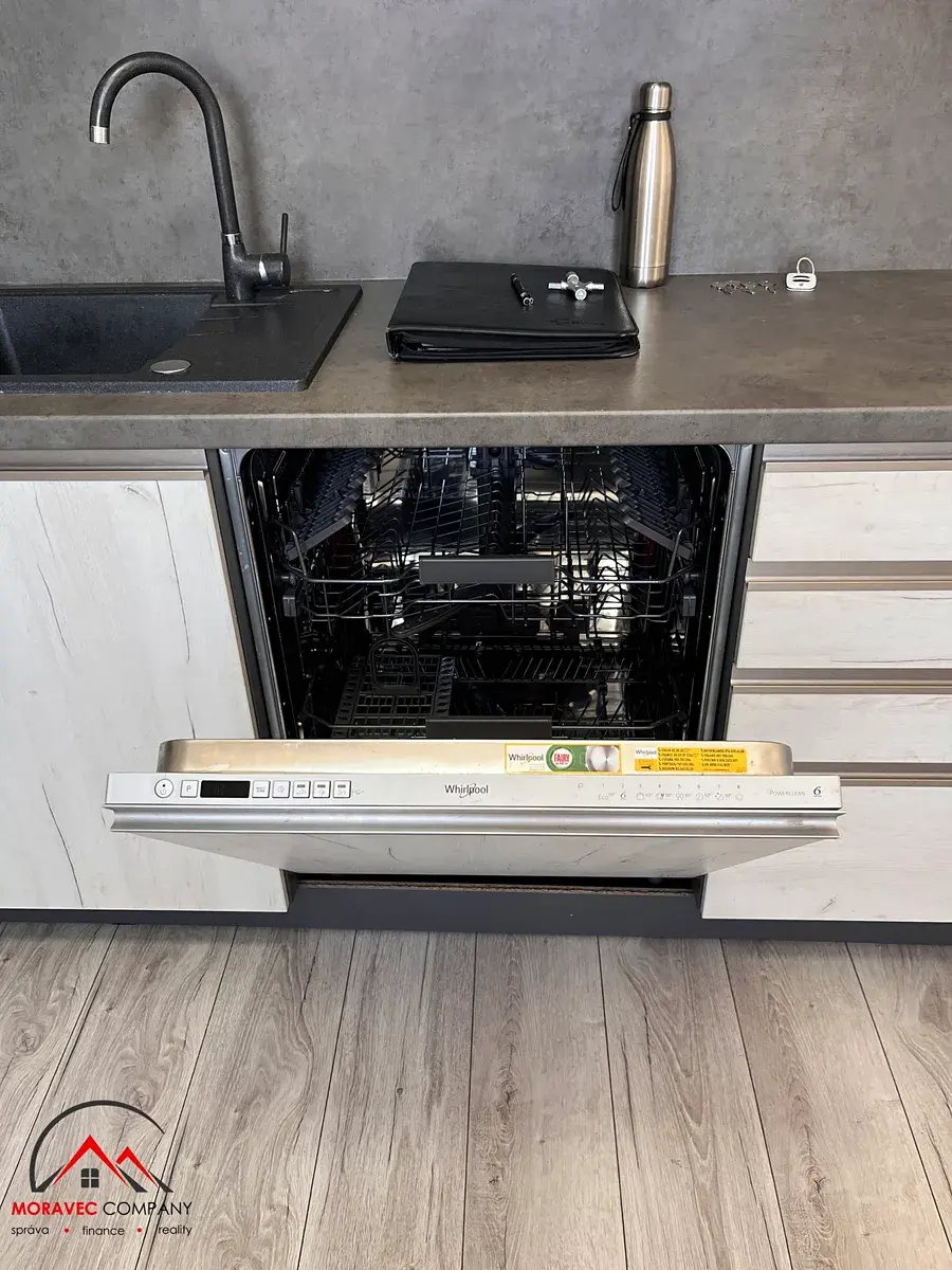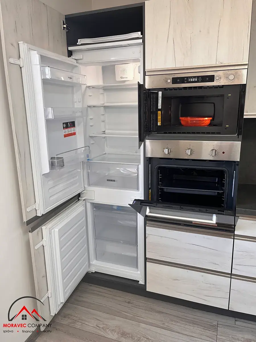 Výhodou je prostorná, moderní kuchyně. Její vybavení zahrnuje indukční varnou desku a další vestavěné spotřebiče: el. troubu, mikrovlnku, digestoř lednici a myčku, což Vám ušetří značné nálady s jejich pořizováním.